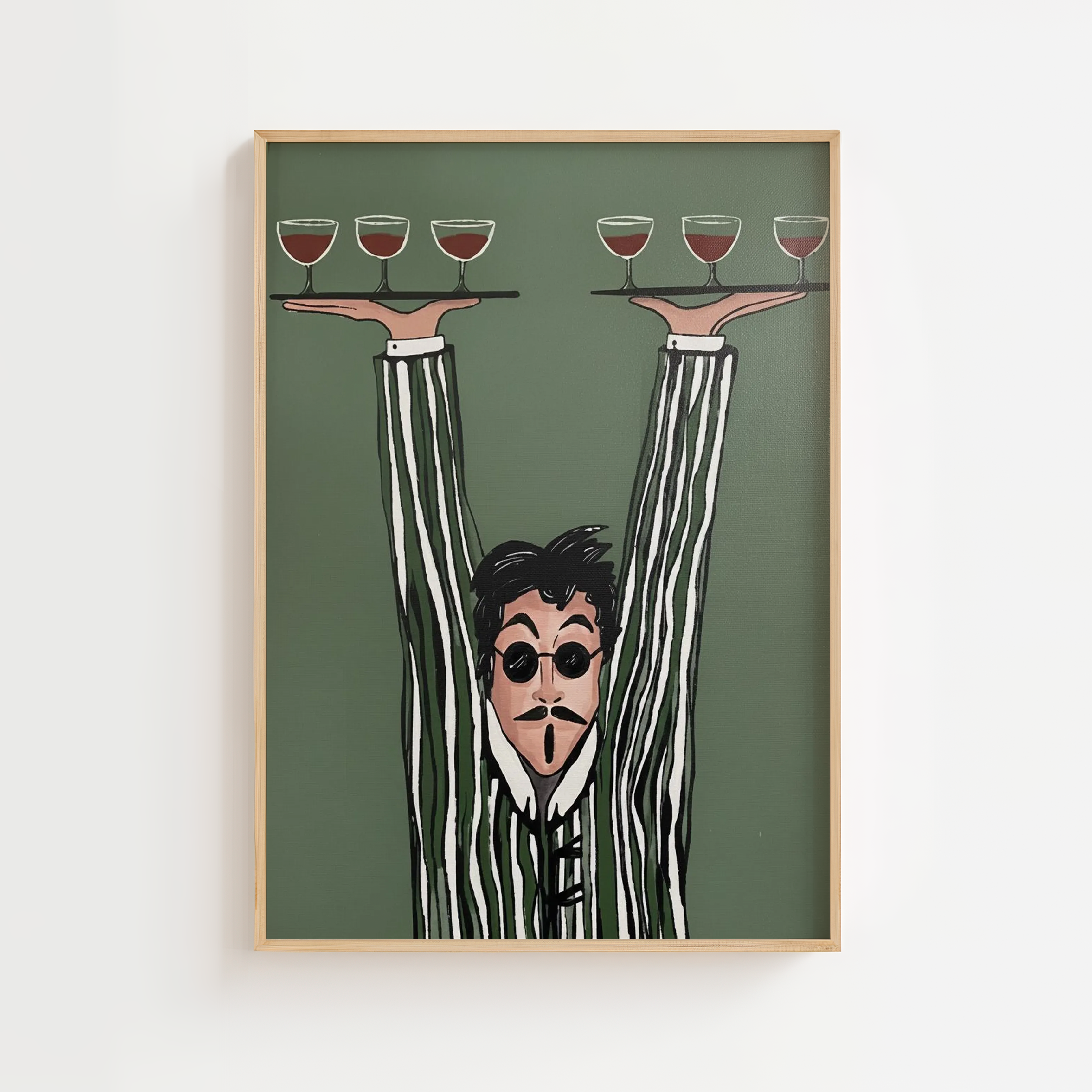 Bring et smil og en kunstnerisk vibe ind i dit hjem med The Wine Waiter Plakat. Motivet viser en karismatisk tjener, der balancerer flere vinglas på begge hænder – tegnet i en unik, håndmalet stil med dybe grønne og varme farver. Plakaten kombinerer humor, charme og kunst, hvilket gør den til et perfekt blikfang i køkkenet, spisestuen eller hjemmebaren.