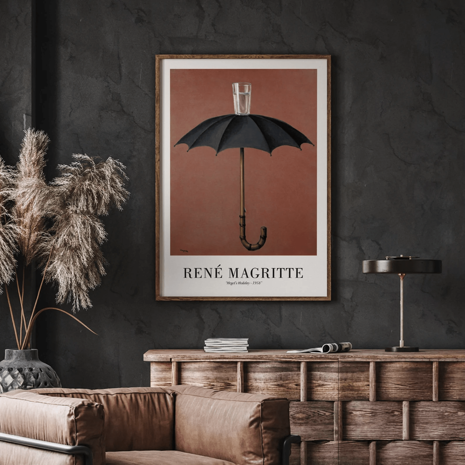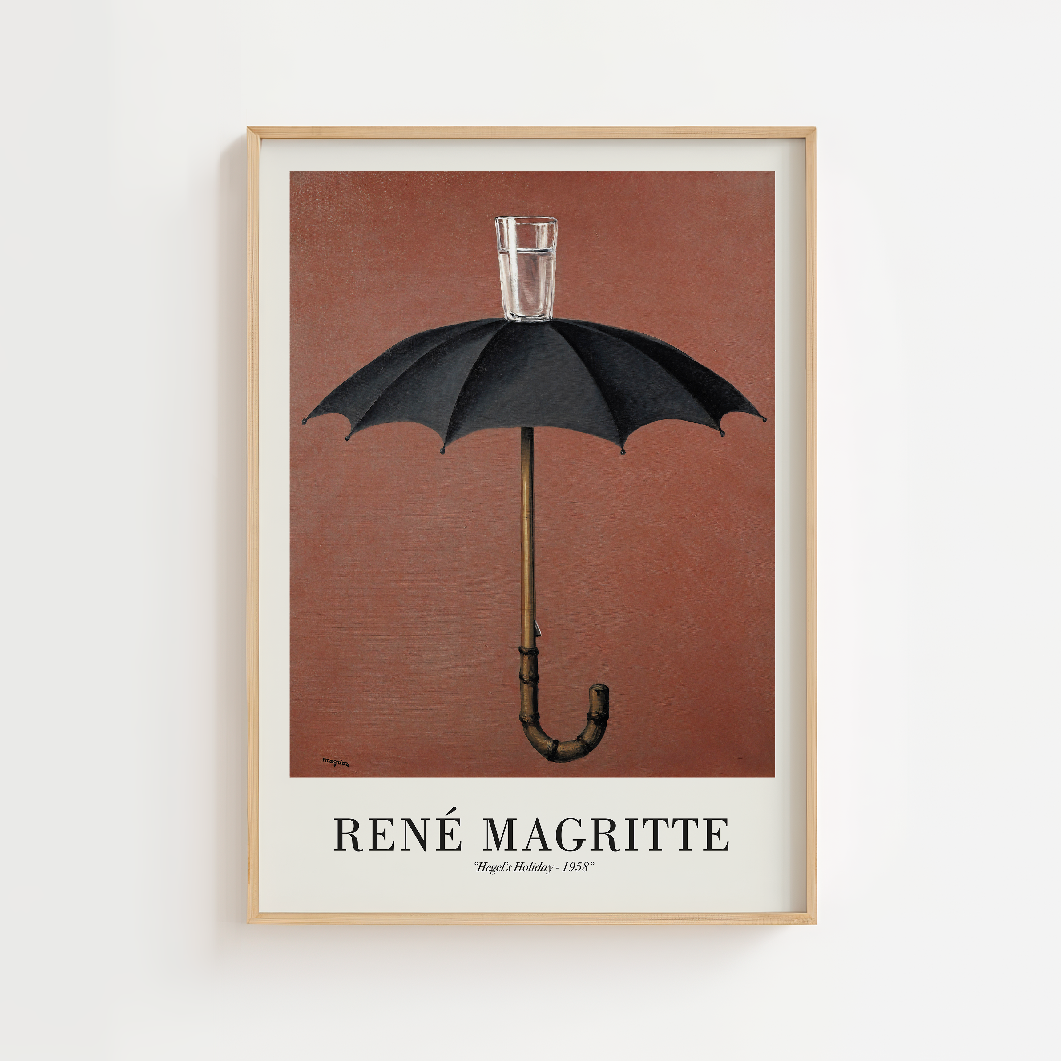 Denne plakat med René Magrittes "Hegel's Holiday" bringer et unikt kunstnerisk udtryk ind i hjemmet. Værket viser en paraply med et glas vand balancerende på toppen – en poetisk og absurd sammensætning, der inviterer til refleksion og samtale. Den varme brunlige baggrund og det minimalistiske design gør denne plakat til et oplagt valg for dig, der ønsker både karakter og dybde i indretningen
