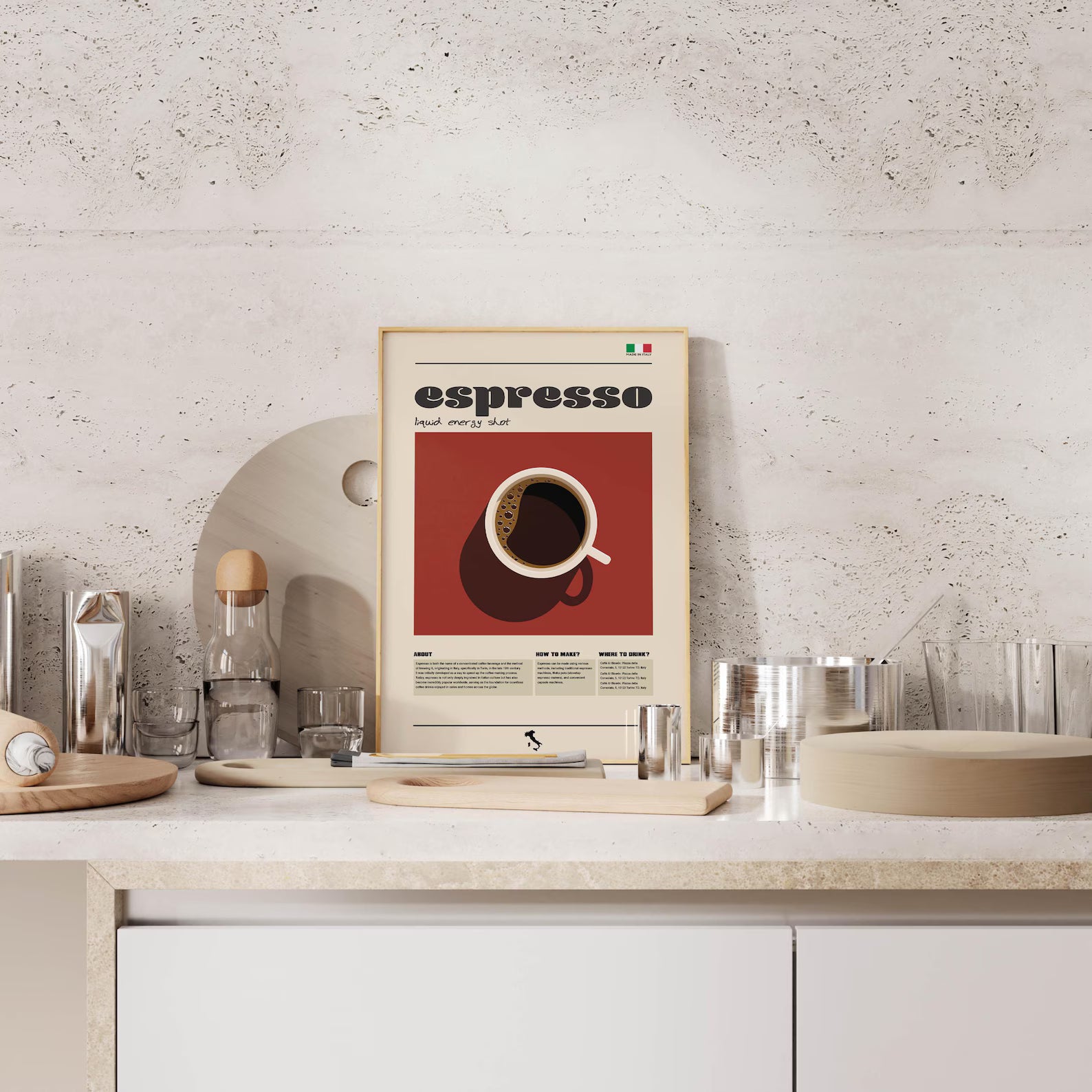 Bring italiensk kaffekultur direkte ind i dit hjem med Espresso Liquid Energy Shot Plakat.