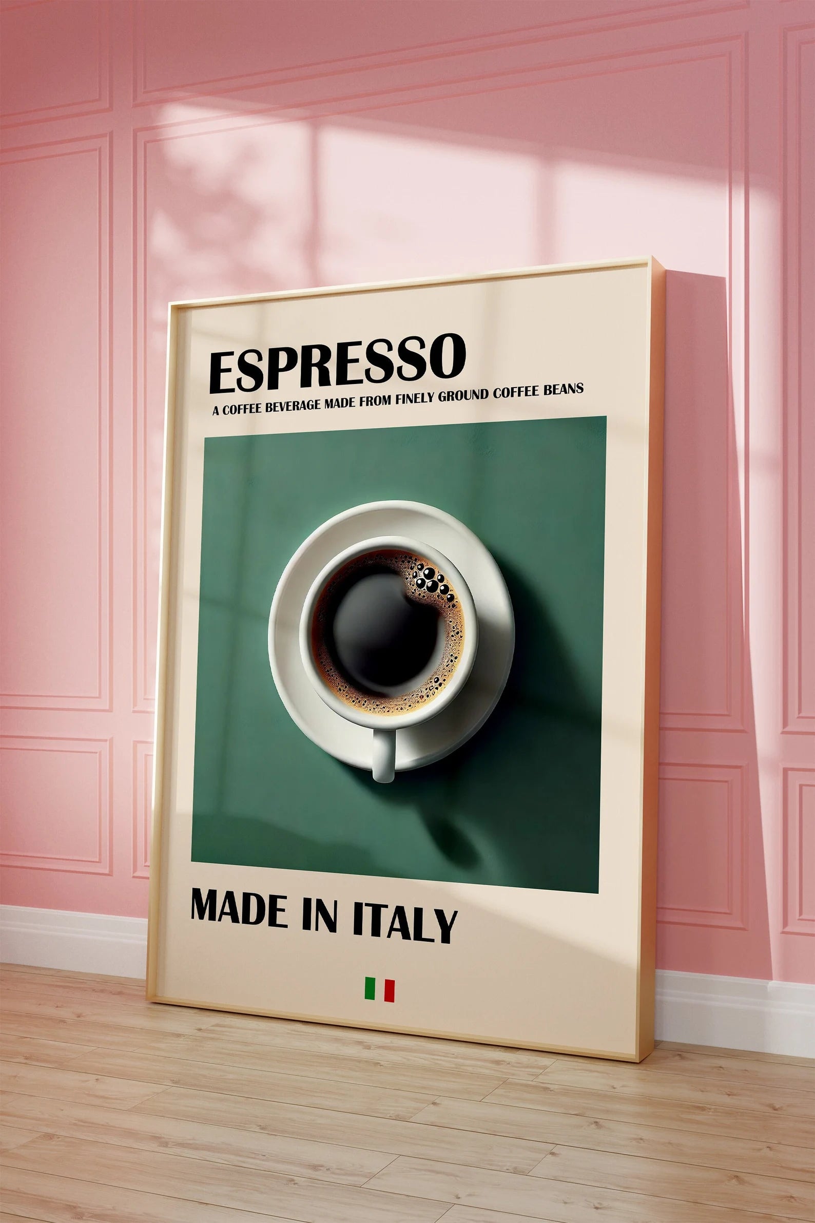 Giv dit køkken et strejf af italiensk caféstemning med Espresso Made in Italy Plakat. Motivet viser en elegant kaffekop med friskbrygget espresso set ovenfra, sat mod en stilren grøn baggrund. Teksten “Made in Italy” og det lille italienske flag understreger espressoens autentiske oprindelse og gør designet både dekorativt og ikonisk.