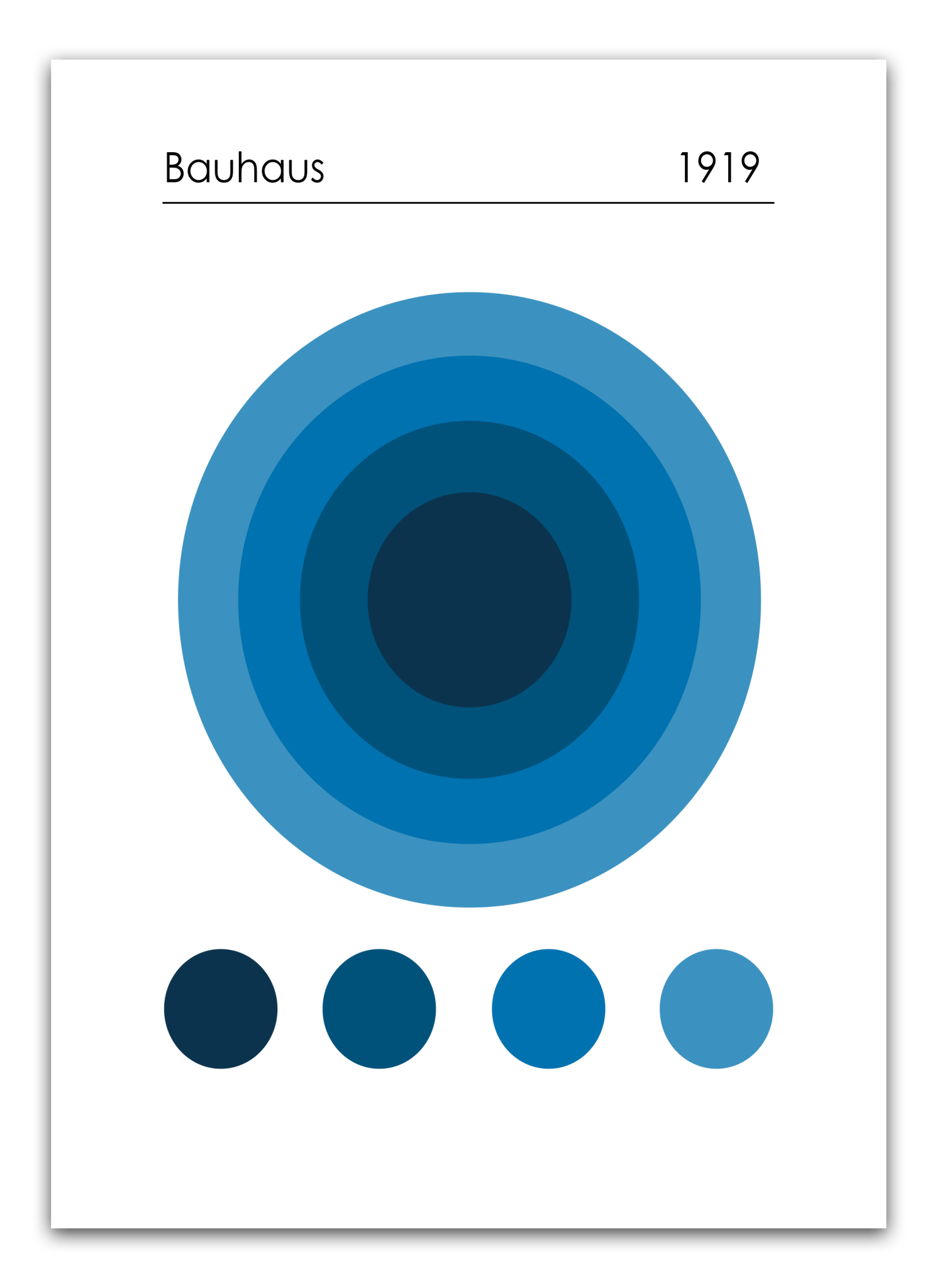 1919 Bauhaus Circles – Plakat er en farverig og grafisk hyldest til Bauhaus-bevægelsen, der blev grundlagt i 1919. Med sit enkle design, tydelige cirkler og primærfarver repræsenterer plakaten alt det, Bauhaus står for: form, funktion og æstetik i perfekt balance.
