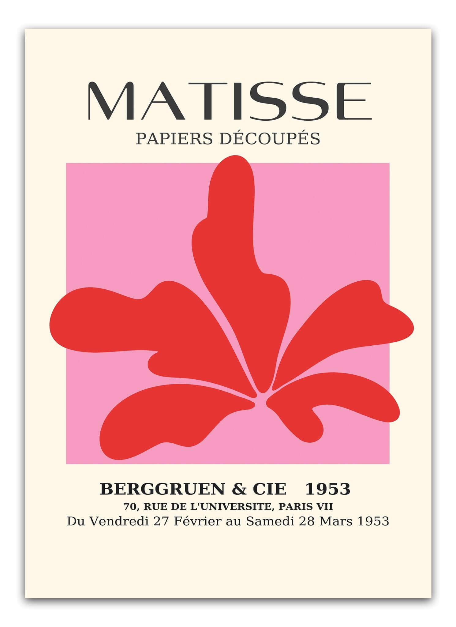 Rød Flour – Matisse Plakat er en kraftfuld og stilren kunstplakat inspireret af Henri Matisse’s ikoniske papirklip. Med sin stærke røde form og enkle, organiske linjer skaber plakaten et levende og kunstnerisk udtryk, der fanger øjet.