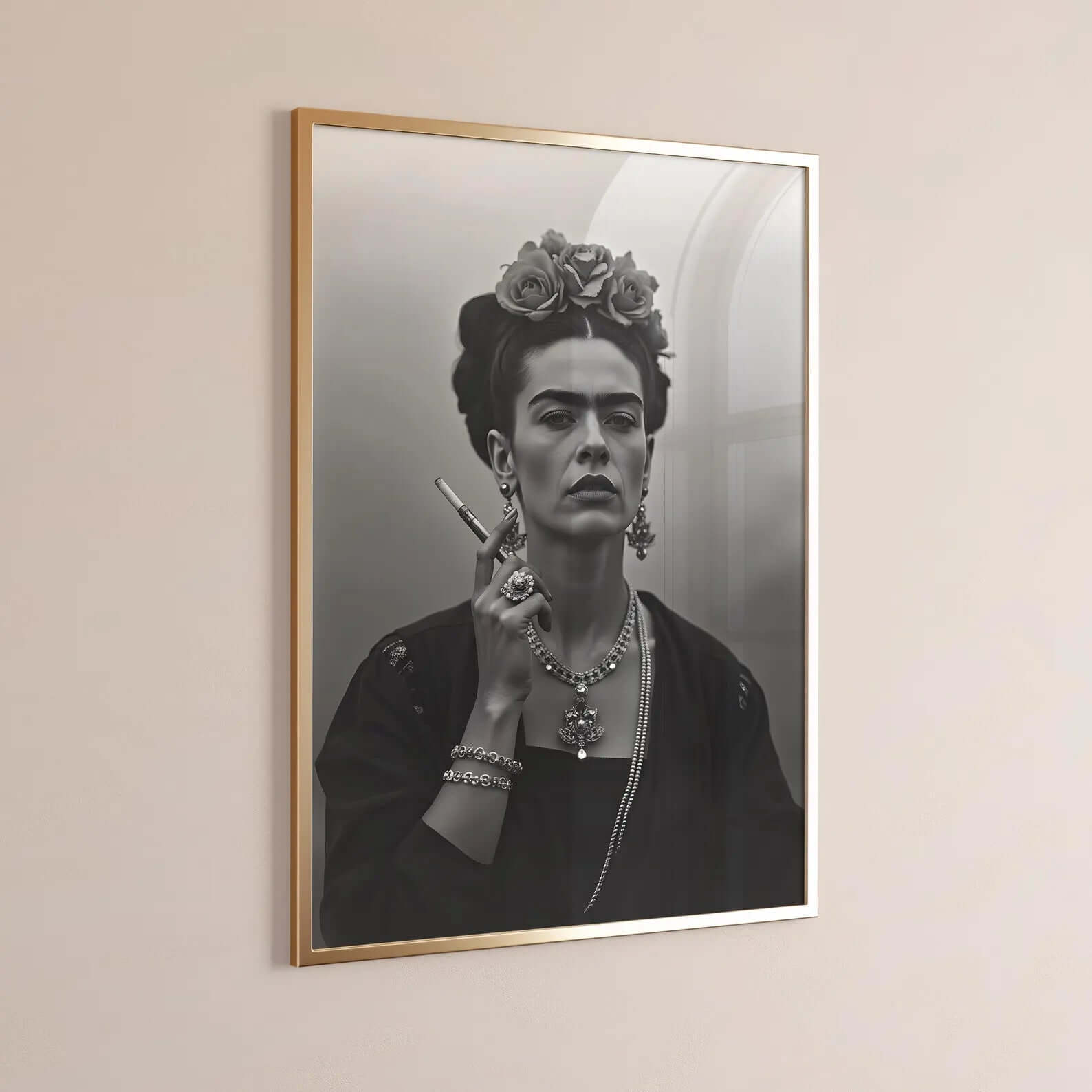 Lad din indretning få kant og personlighed med Smoking Icon – Frida Kahlo Plakat. Det sort-hvide motiv viser Frida Kahlo i et ikonisk og kraftfuldt øjeblik, hvor hendes styrke og attitude træder tydeligt frem.