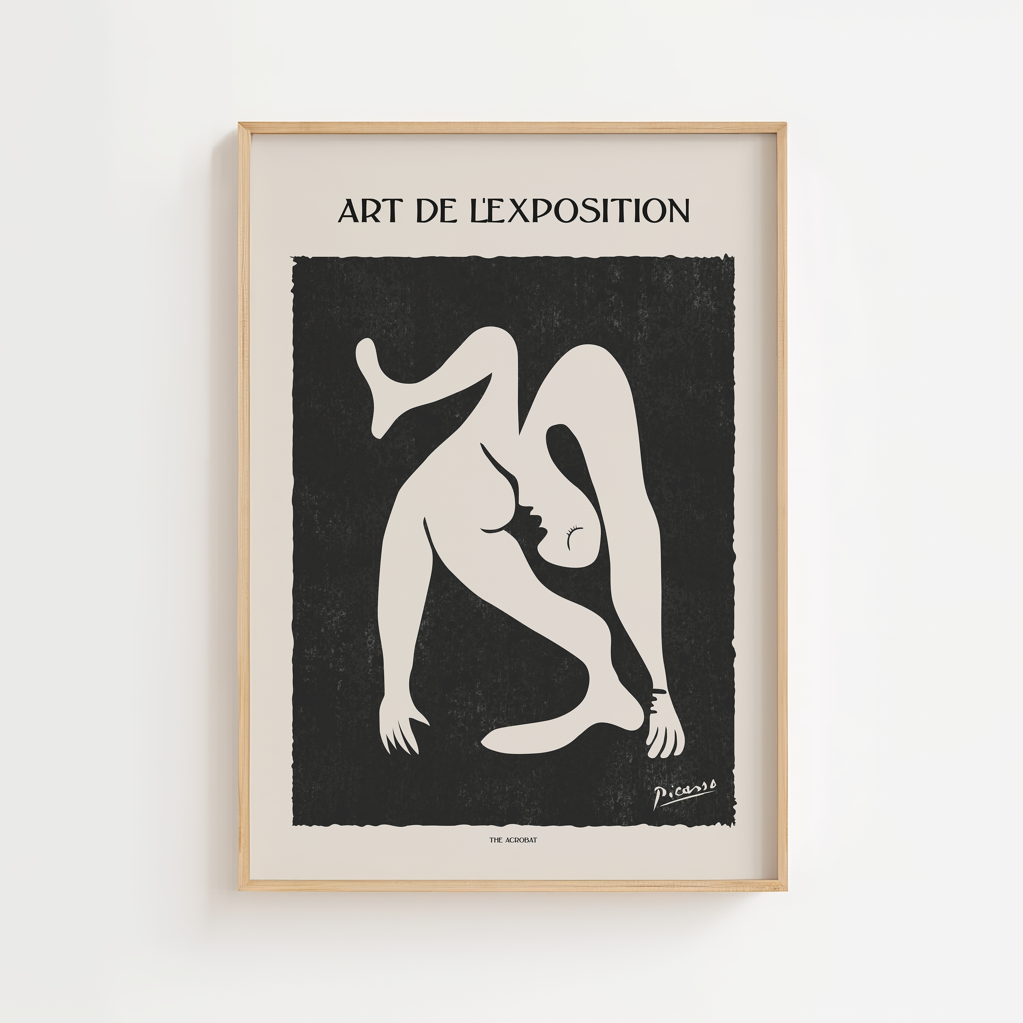 Acrobate – Picasso Plakat er en udtryksfuld og moderne sort-hvid kunstplakat, der viser en akrobatisk figur i Picassos velkendte stregstil. Med sin enkle og kraftfulde komposition tilfører plakaten kant og elegance til enhver indretning.