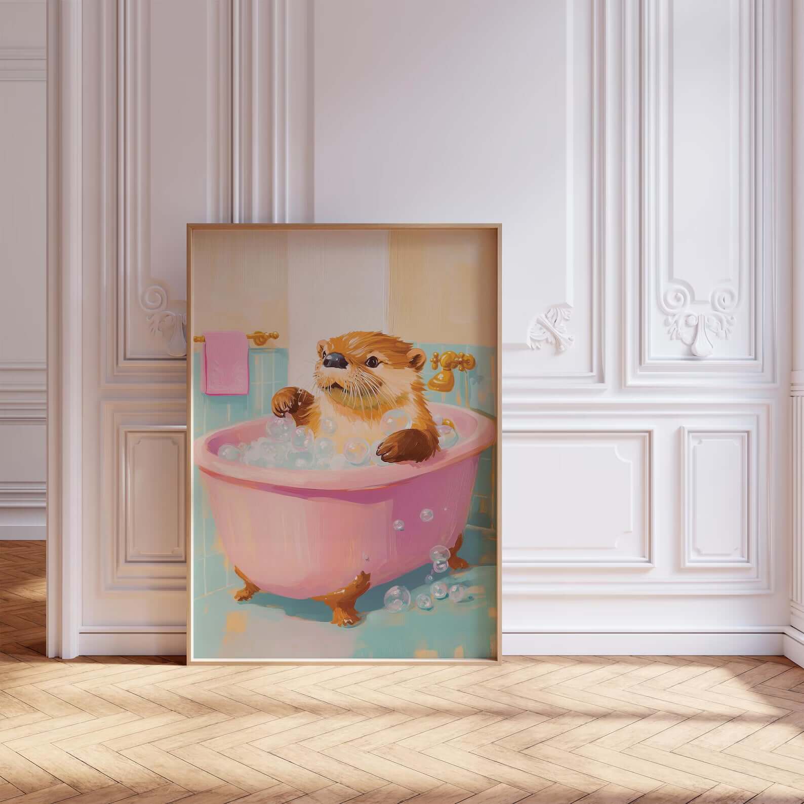 Denne charmerende plakat forestiller en sød odder, der nyder et afslappende skumbad i et lyserødt badekar. Det bløde, maleriske udtryk og de varme pastelfarver skaber en hyggelig og legende stemning, som passer perfekt til badeværelset.