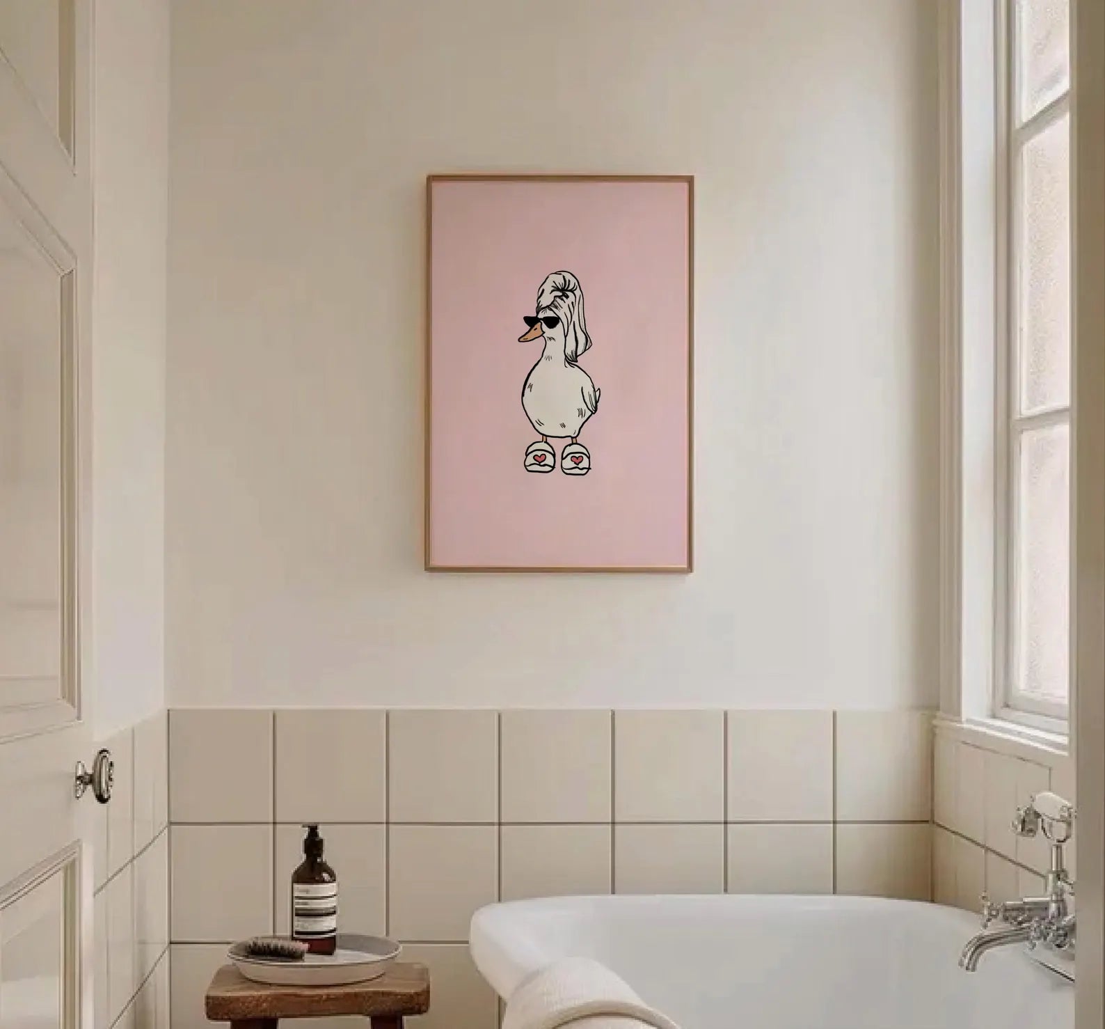 Den bløde rosa baggrund giver et varmt og roligt udtryk, mens illustrationens fine detaljer gør plakaten til et blikfang uden at være for meget. Perfekt til badeværelset, soveværelset, teenageværelset eller som gave til én, der fortjener et smil i hverdagen.