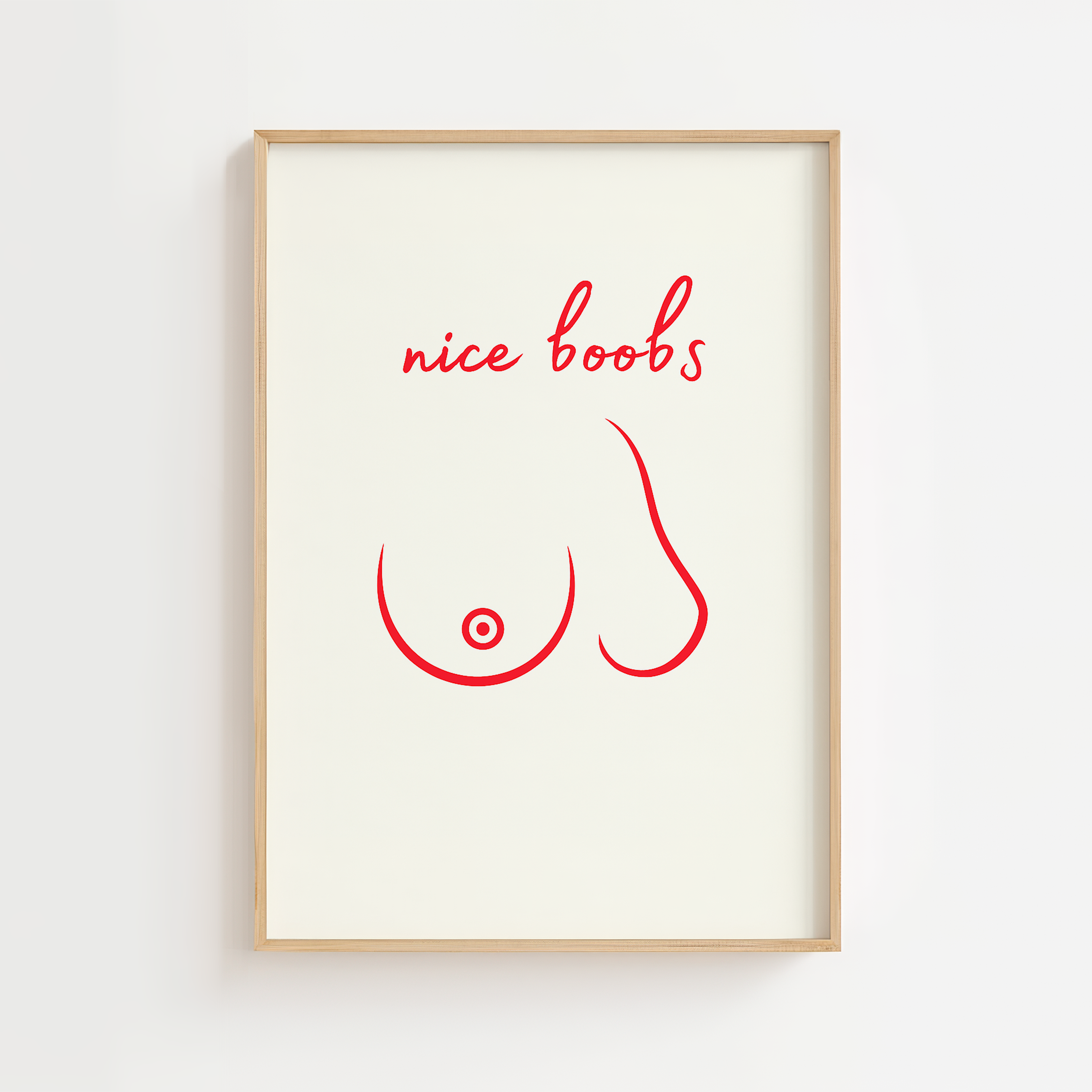 Plakaten fås i flere størrelser, så du kan finde den perfekte pasform til din indretning. Bestil din Nice Boobs Plakat i dag og giv dine vægge et kunstnerisk twist