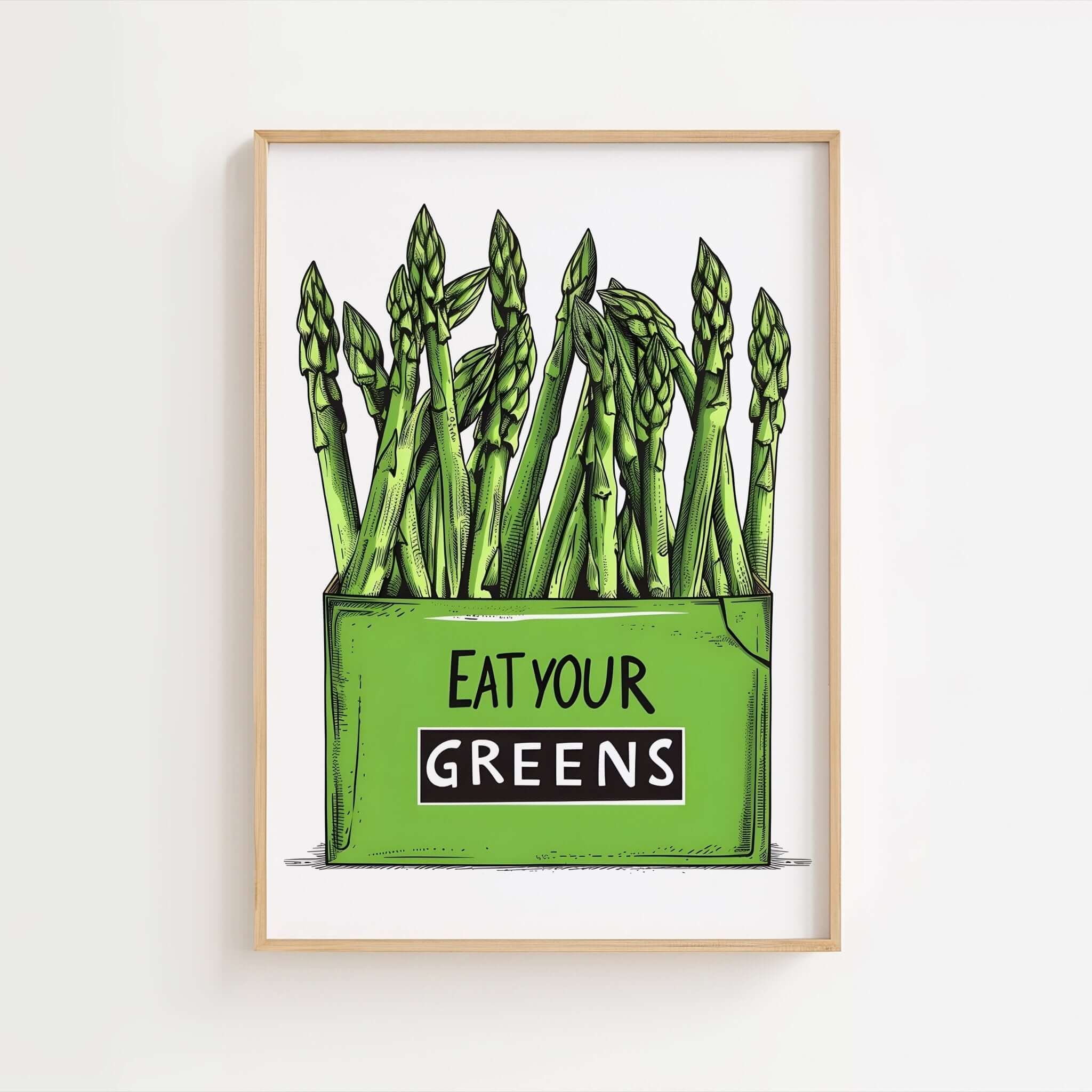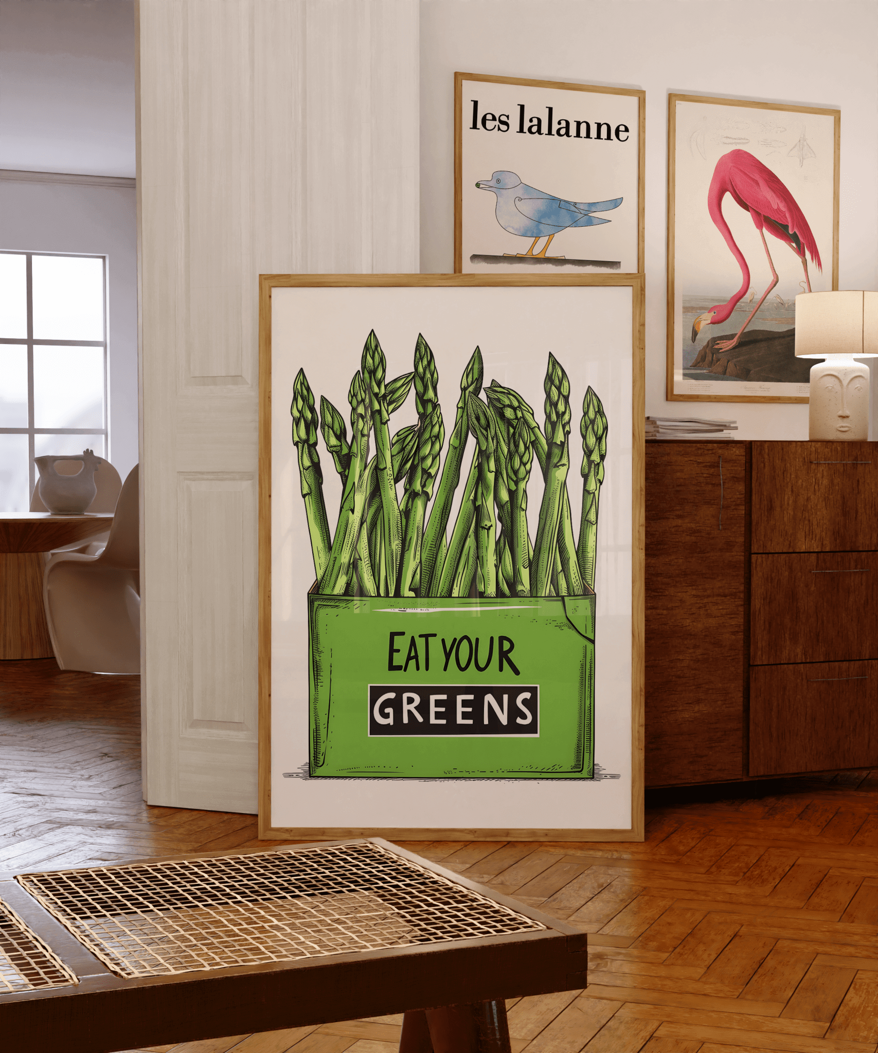 Bring humor og farve ind i køkkenet med denne Eat Your Greens-plakat. Med en frisk grøn farve og motiverende tekst er den ideel til både madentusiaster og vegetarer. Plakaten passer perfekt som del af en billedvæg i køkkenet, i spisestuen eller i en moderne café.