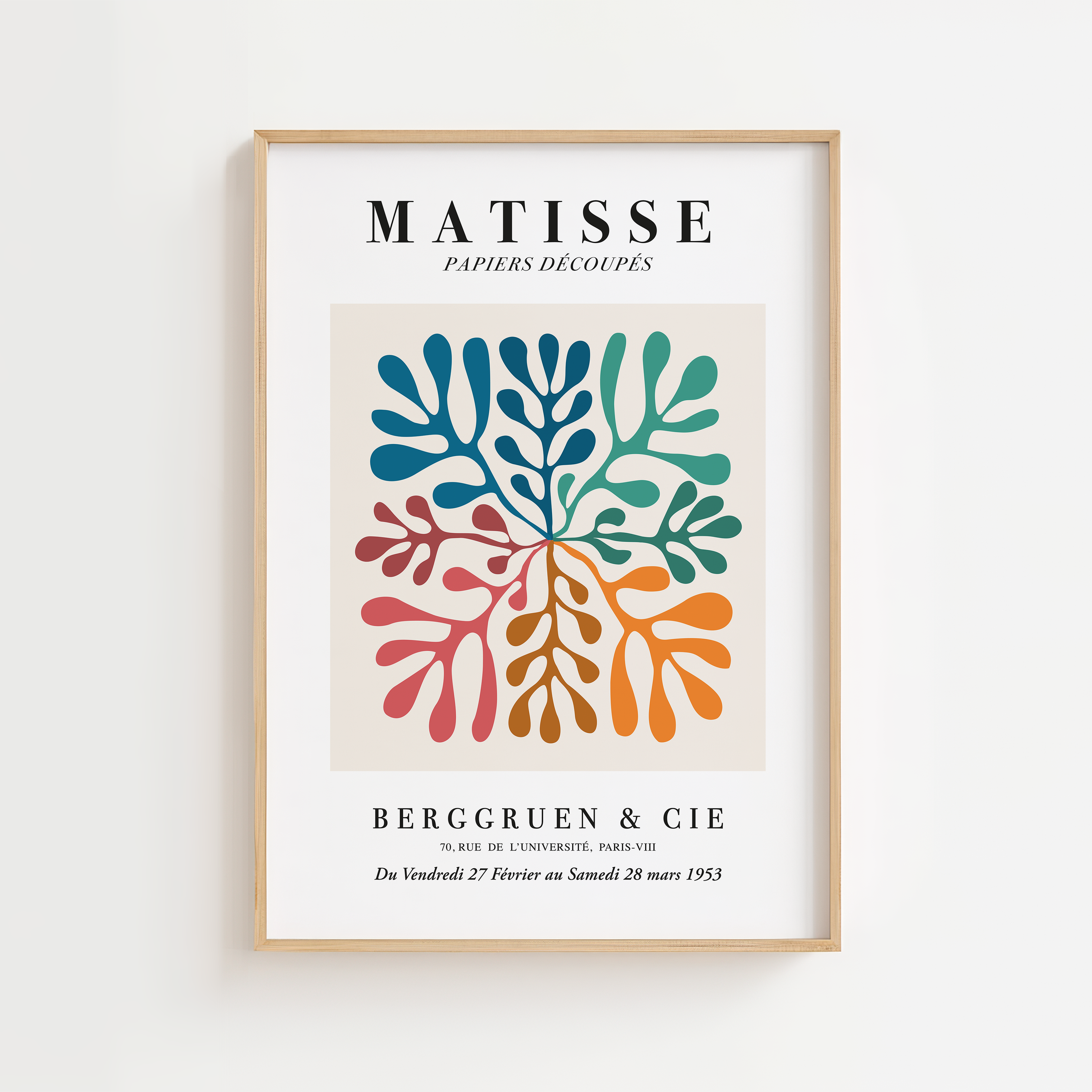 Harmonic Leaves – Matisse Plakat er et elegant og farverigt kunstværk inspireret af Henri Matisse’ ikoniske papiers découpés.