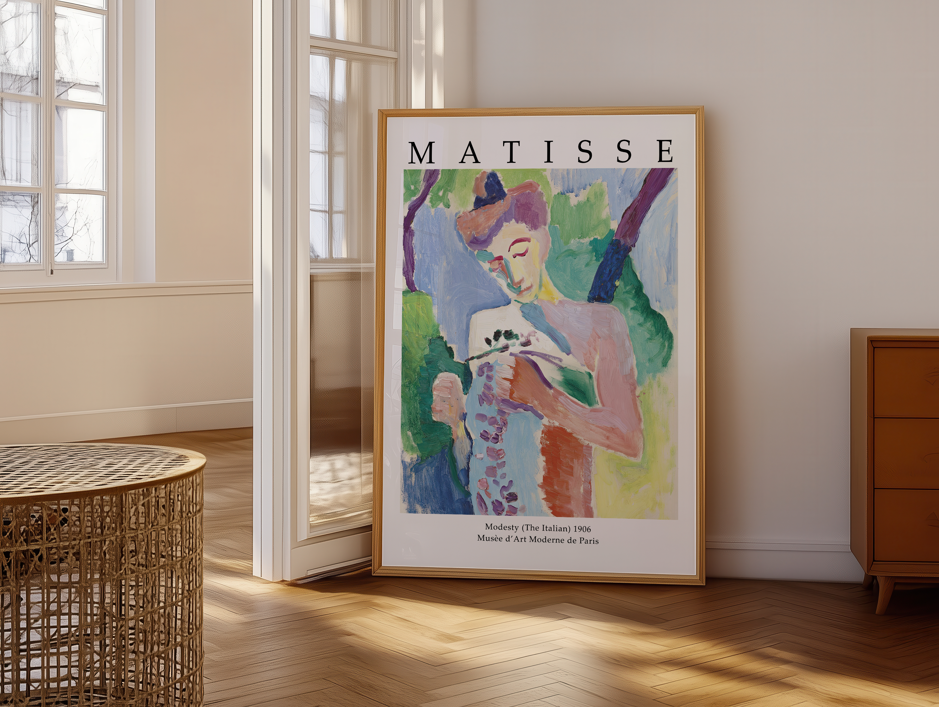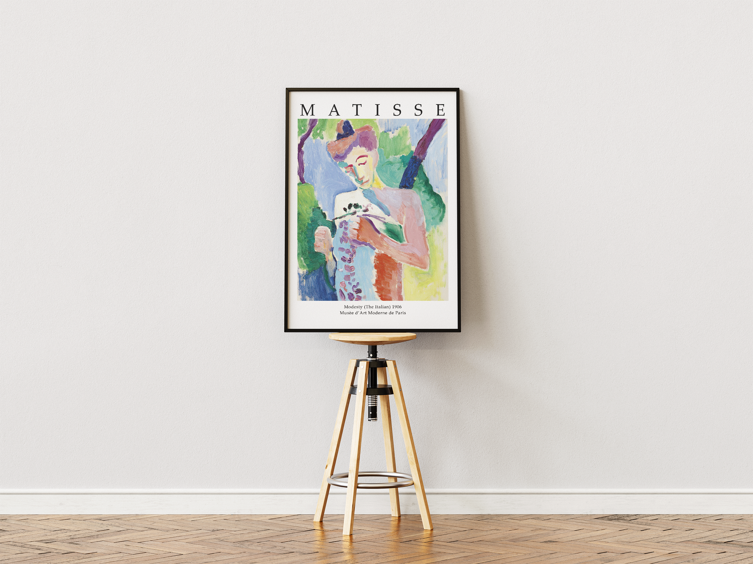 Tilfør dit hjem en poetisk og farverig energi med ‘Modesty (The Italian)’ – Matisse Plakat. Dette værk fra 1906 er et strålende eksempel på Matisse’ tidlige fauvistiske periode, hvor kraftige farver, ekspressive penselstrøg og bløde figurer skaber et levende og drømmende udtryk.