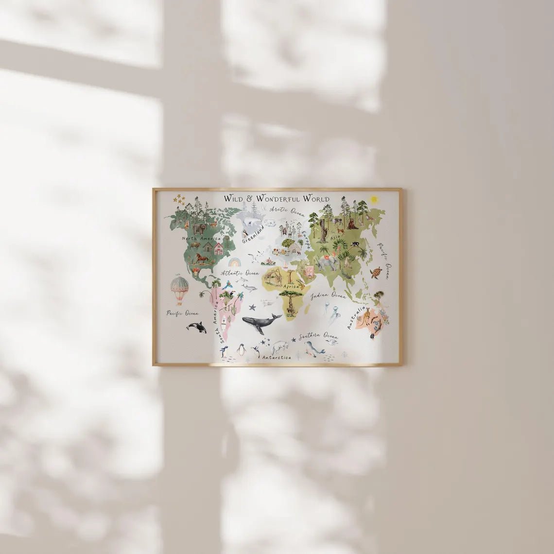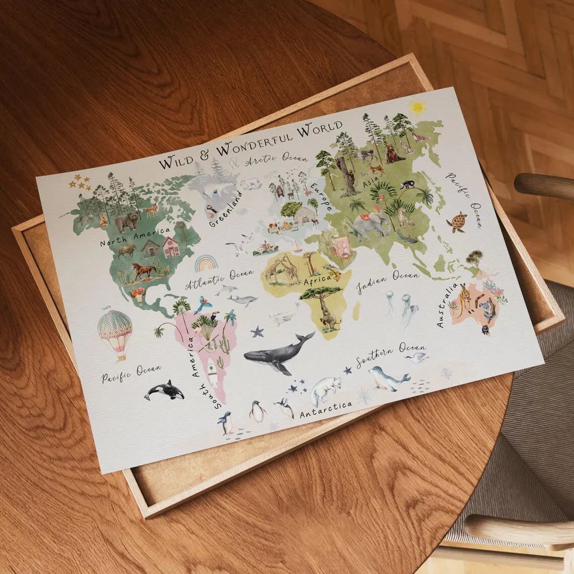 Verdenskort til Børn – Plakat gør læring sjov og farverig! Plakaten viser verdens kontinenter, dyr og flag på en spændende og børnevenlig måde, der vækker nysgerrighed og lyst til at lære om verden.