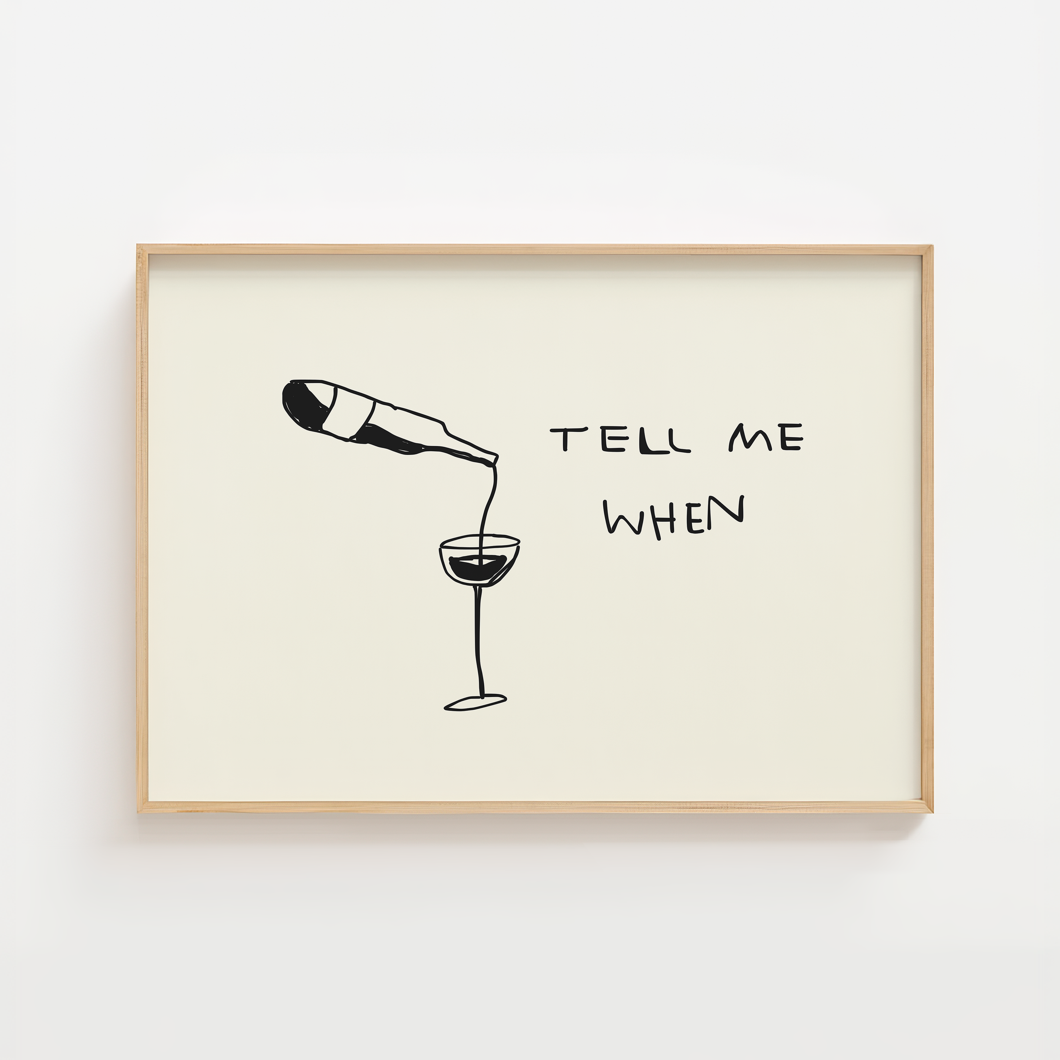 Tilføj et smil til væggen med Tell Me When Vinplakat – et minimalistisk og humoristisk motiv, der viser en vinflaske, der hælder i et vinglas, ledsaget af teksten “Tell Me When”. Den enkle stregtegning gør plakaten stilren og moderne, og den passer perfekt ind i både skandinaviske køkkener og hyggelige hjemmebarer.