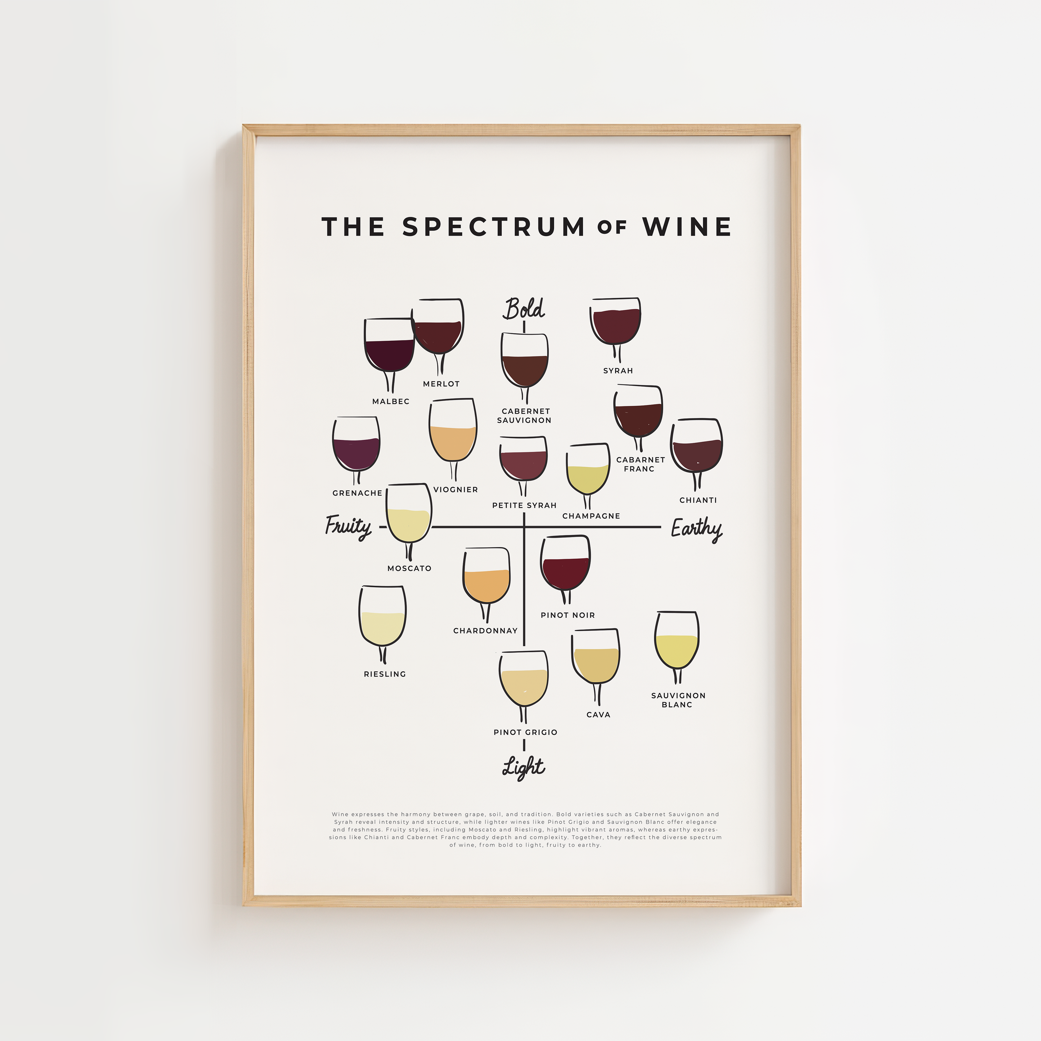 Gør din indretning både stilfuld og informativ med The Spectrum of Wine Plakat. Plakaten viser vinens smagsspektrum fra bold og earthy til fruity og light, illustreret med små vinglas i forskellige farver og vinvarianter som Merlot, Syrah, Viognier, Chardonnay og Pinot Grigio.