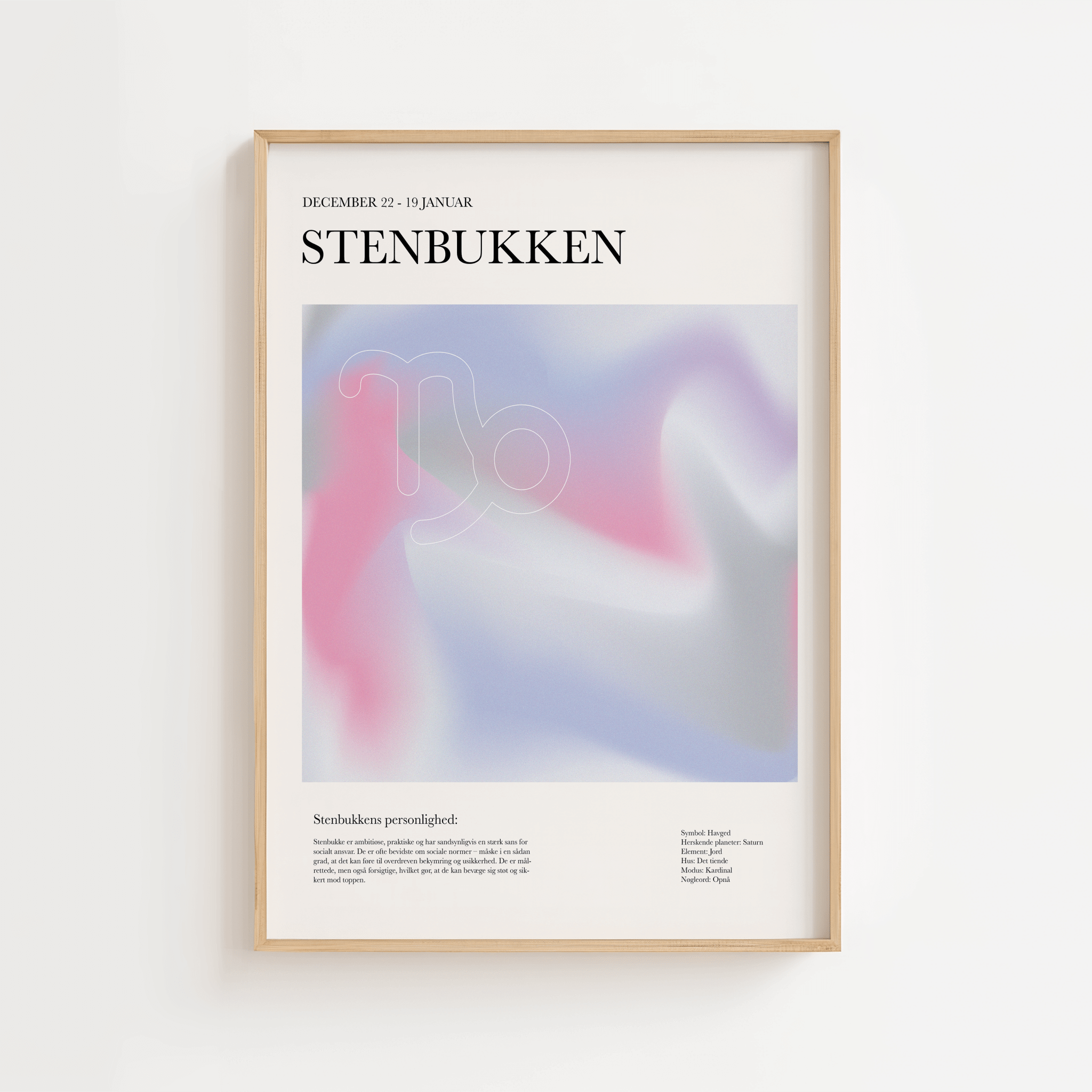 Er du eller en du holder af født i stenbukkens tegn? Denne smukke stjernetegns plakat forener farverig kreativitet med den stabile og ambitiøse energi, der kendetegner stenbukken. Plakaten udtrykker jordnærhed, disciplin og tidløs ro – alt sammen i et moderne og legende design, der lyser op i enhver indretning.