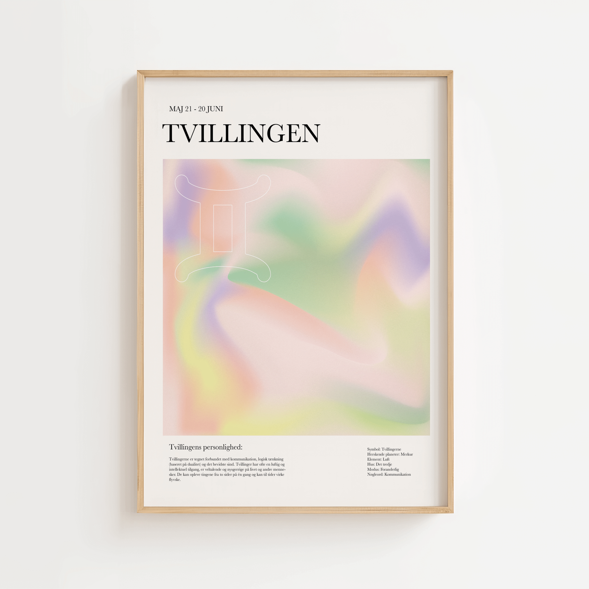 Tvillingens tegn emmer af nysgerrighed, kommunikation og fleksibilitet. Denne farverige stjernetegns plakat er skabt til dem, der elsker livlighed, lethed og personlig stil. Plakaten er både moderne og legende, og indfanger tvillingens lette sind og åbne natur med et unikt kunstnerisk udtryk.