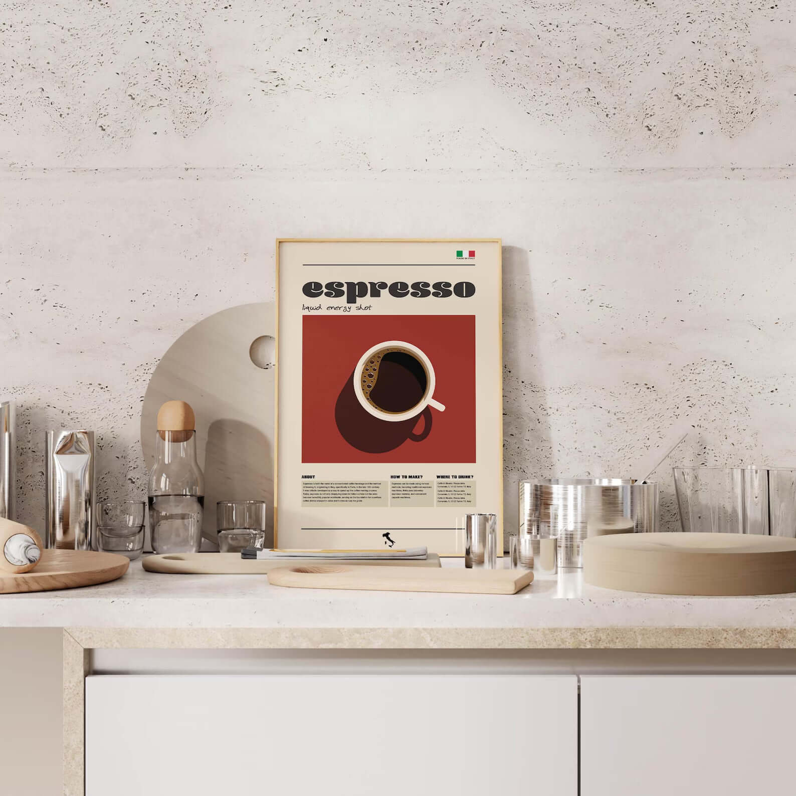 Designet emmer af vintage caféæstetik og italiensk energi, hvilket gør den perfekt til dit kaffehjørne, køkken, kontor eller som en del af en coffee-lover billedvæg.