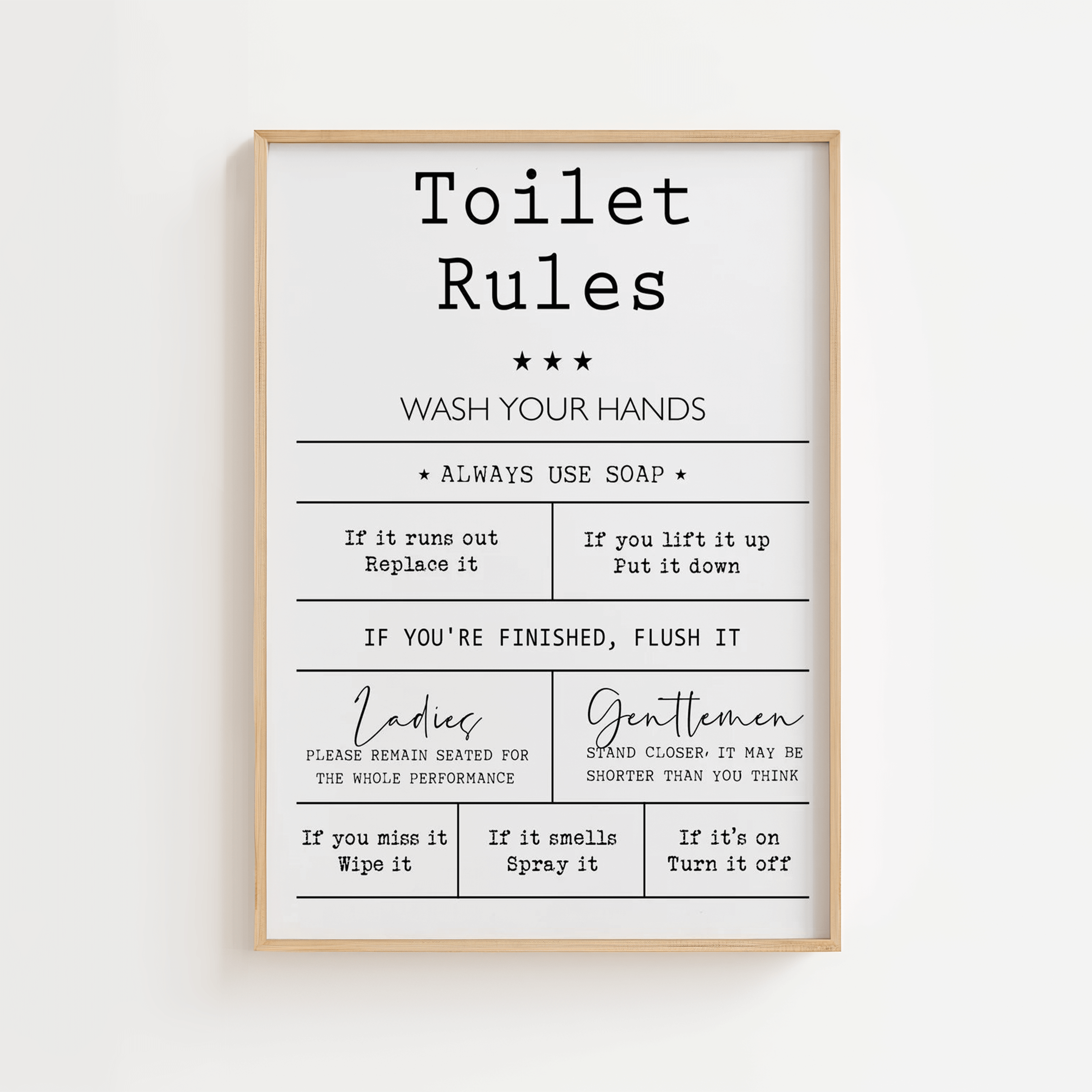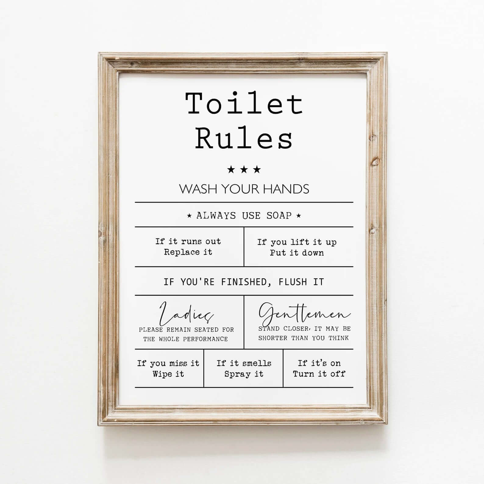 Gør dit badeværelse lidt sjovere med denne humoristiske plakat med "Toilet Rules". Den samler de vigtigste (og sjoveste!) regler for toiletbesøg – fra at vaske hænder og bruge sæbe til klassiske bemærkninger til både damer og herrer. Perfekt til at give gæsterne et grin og tilføje personlighed til dit toilet. Designet i sort-hvid, så det passer til alle typer indretning. Plakaten fås i flere størrelser og trykkes på kvalitetspapir – klar til at gøre dit badeværelse lidt mere underholdende.