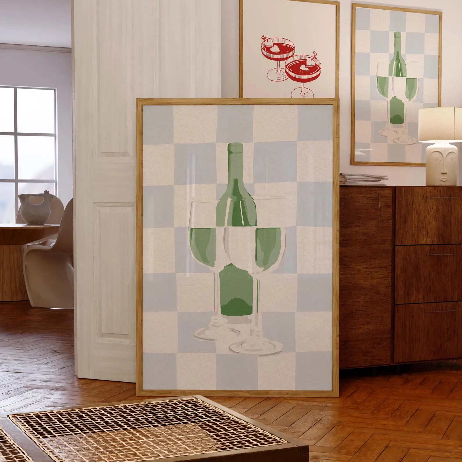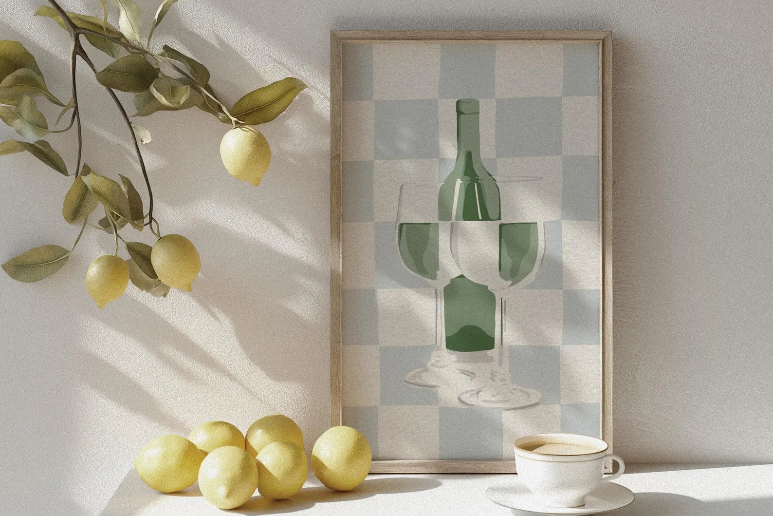 Tilføj et friskt og moderne touch til køkkenet eller hjemmebaren med Green Wine Bottle & Glasses Plakat. Motivet viser en stilren grøn vinflaske og to vinglas illustreret oven på en blød, ternet baggrund i lyse nuancer. Den enkle, nordiske streg giver plakaten et roligt og elegant udtryk, som passer perfekt til skandinavisk indretning.