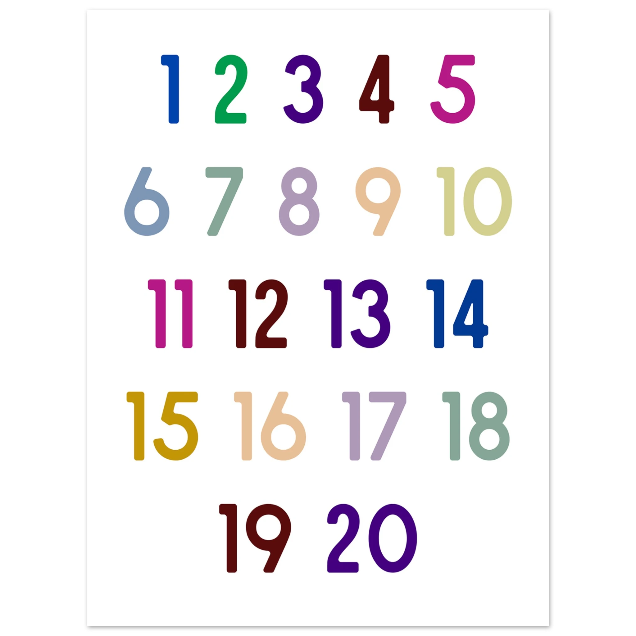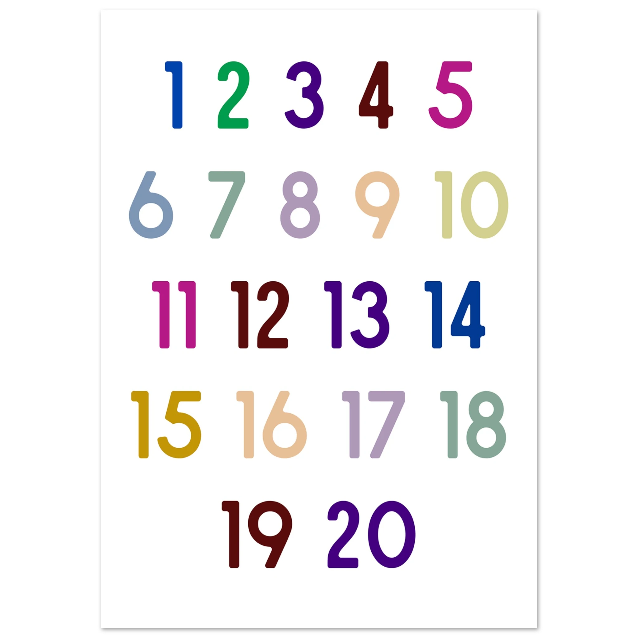 1-20 Tal Plakat er en sjov og farverig måde at introducere tal på for de mindste. Med et indbydende design hjælper plakaten børn med at lære at tælle fra 1 til 20, samtidig med at den pynter flot på væggen. Perfekt til børneværelset, klasselokalet eller som gaveidé til små tal-entusiaster. Skab en lærerig atmosfære og gør det sjovt at lære!