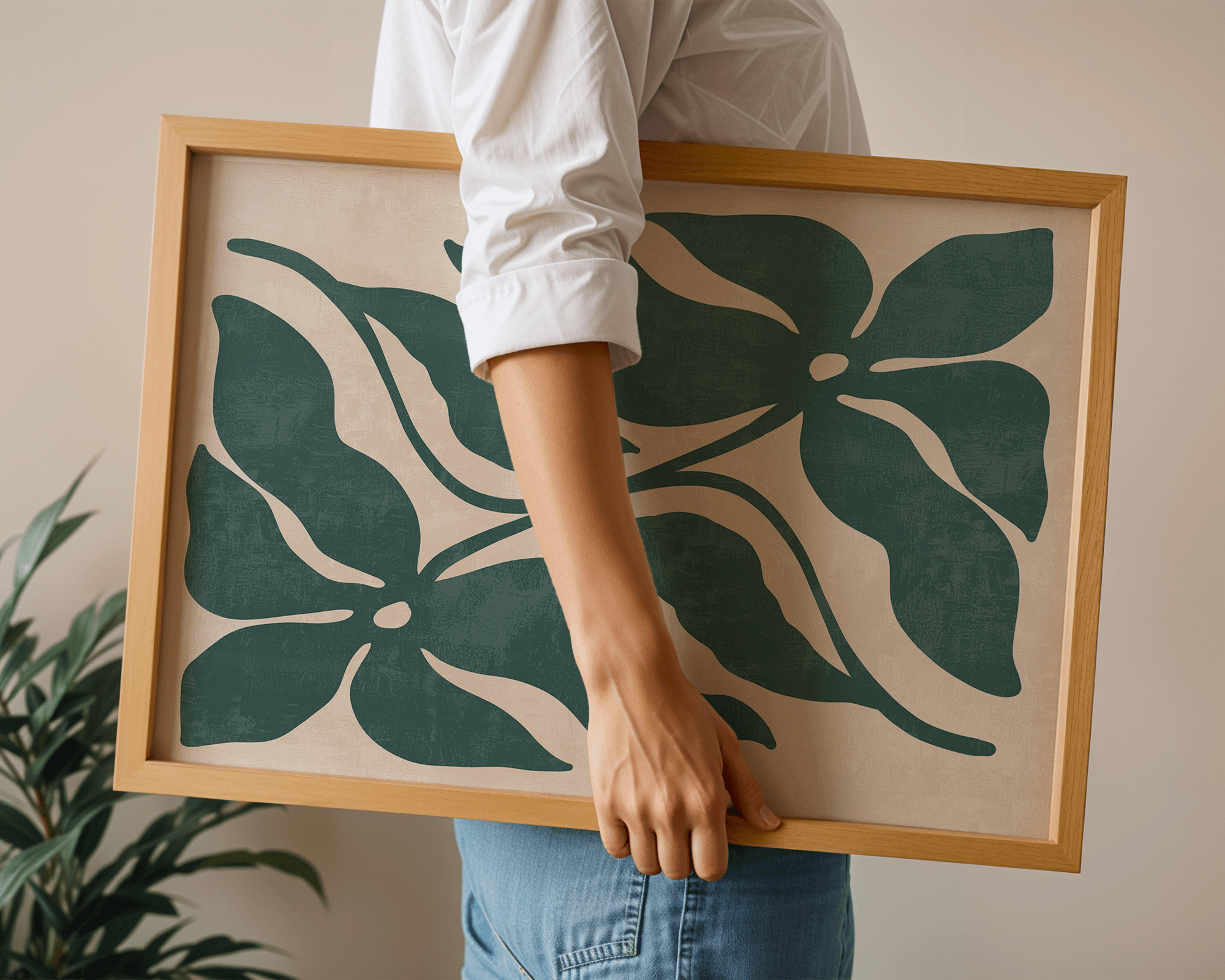 Designet passer smukt ind i skandinaviske hjem og kombinerer det bedste fra naturinspiration og moderne grafik. Brug den alene for et enkelt look, eller sammen med andre moderne blomster- og naturplakater for at skabe en hel billedvæg med ro og personlighed.