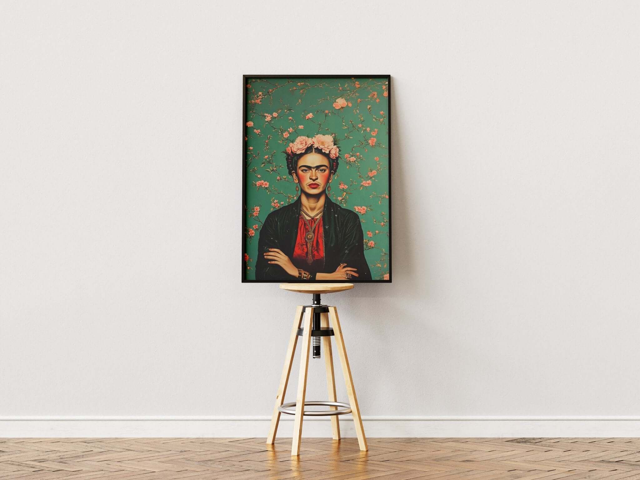 Tilføj farve og karakter til dine vægge med Grøn Blomsterbaggrund – Frida Kahlo Plakat. Motivet viser den ikoniske kunstner foran en detaljeret grøn baggrund fyldt med rosa blomster, der fremhæver hendes stærke udtryk og unikke stil. Perfekt til stuen, soveværelset eller kontoret, og trykt på højkvalitets plakatpapir for skarpe detaljer og lang holdbarhed