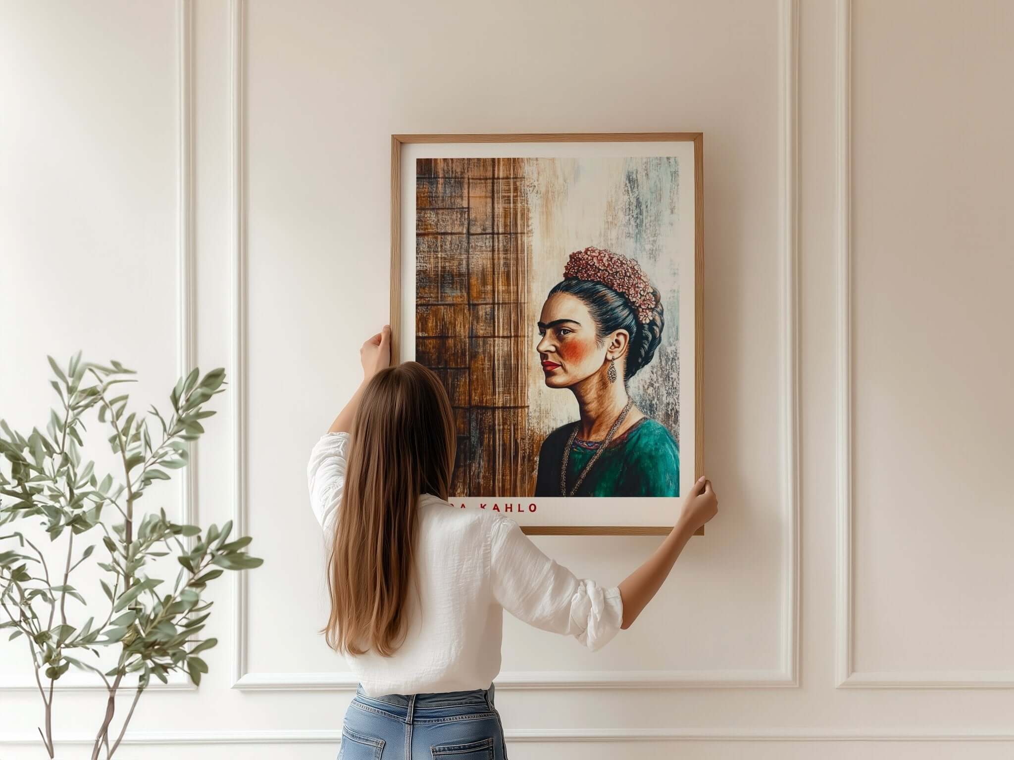 Trævæg Profil – Frida Kahlo Plakat viser den berømte kunstner i et markant sideportræt, iført grøn kjole og røde blomster i håret. Den rustikke træbaggrund giver varme og kontrast til de klare farver, hvilket gør plakaten til et iøjnefaldende element i din boligindretning. Trykt på kvalitetspapir for skarpe detaljer og lang holdbarhed.