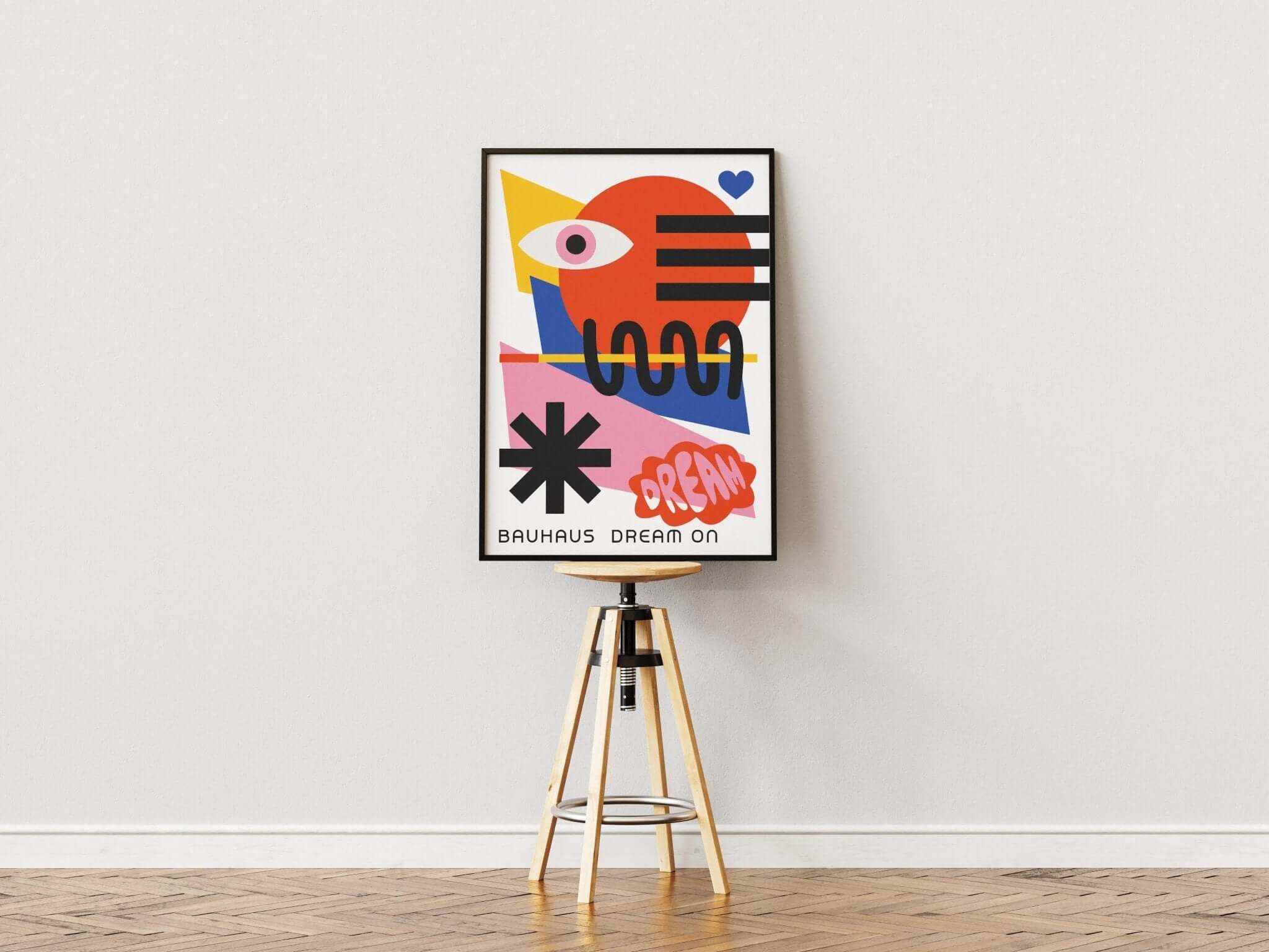 Drøm stort med vores "Bauhaus Dream On" plakat. Denne unikke plakat fusionerer Bauhaus-stilen med moderne inspiration. Lad dine drømme flyve højt med dette kunstneriske statement på dine vægge!