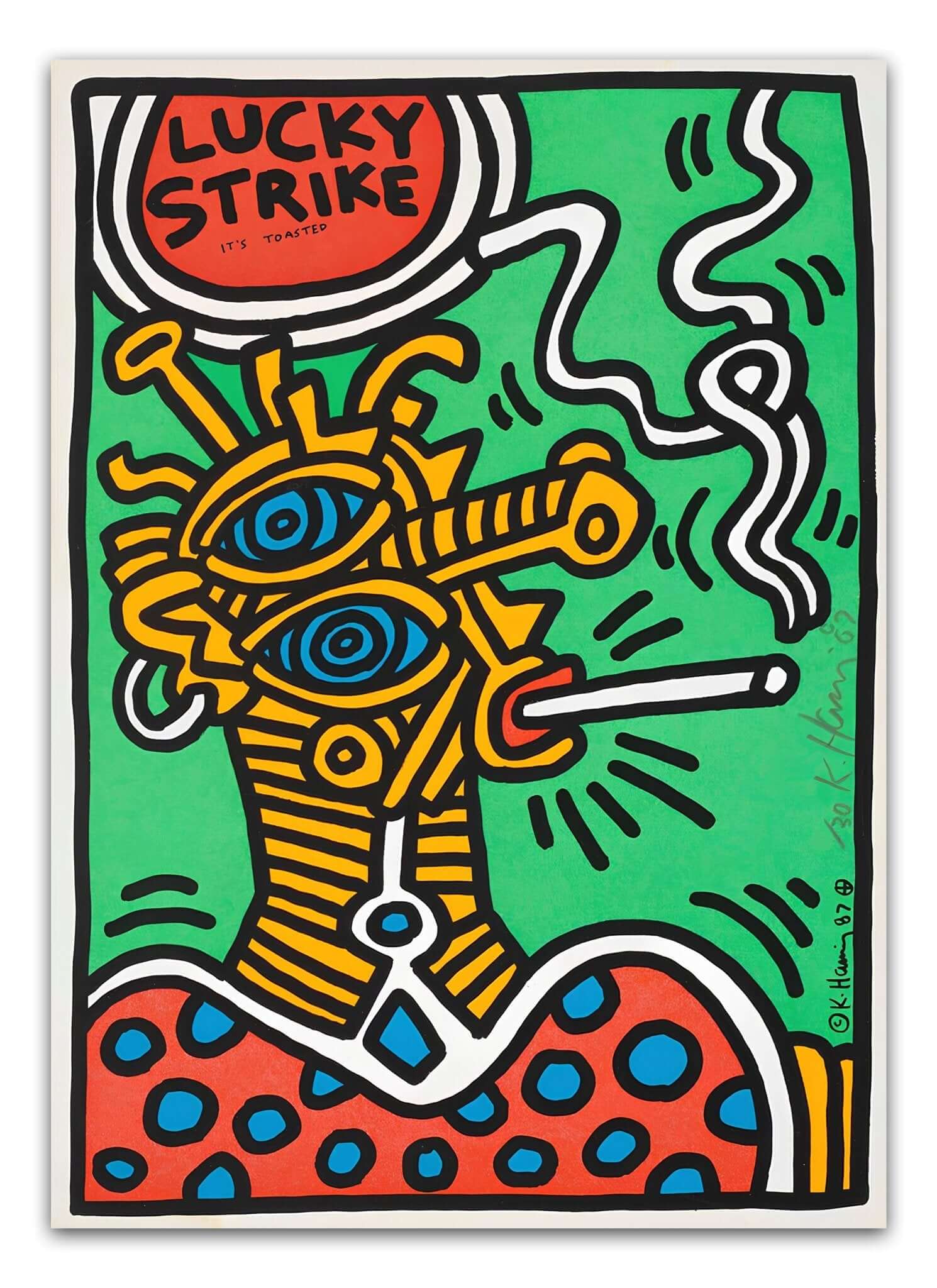 Lucky Strike - Keith Haring plakaten bringer kunst og farver ind i dit hjem. Denne ikoniske kunstplakat er perfekt til stuen, køkkenet eller børneværelset og tilføjer en unik, kunstnerisk atmosfære. Med sine livlige farver og Haring's karakteristiske stil er den et must-have for kunstelskere. Køb denne og andre kunstplakater hos os i dag.