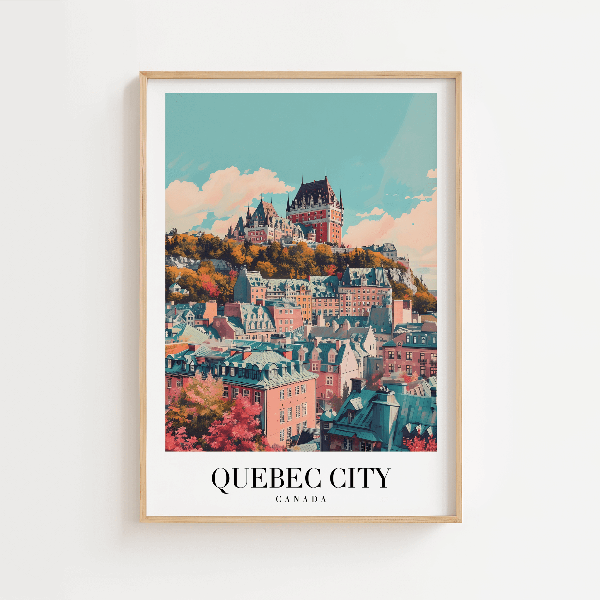 Oplev charmen fra en af Nordamerikas ældste og smukkeste byer med denne Quebec City Canada – Byplakat. Plakaten viser den ikoniske skyline med Château Frontenac og byens farverige tage, der sammen skaber en hyggelig og eventyrlig atmosfære.