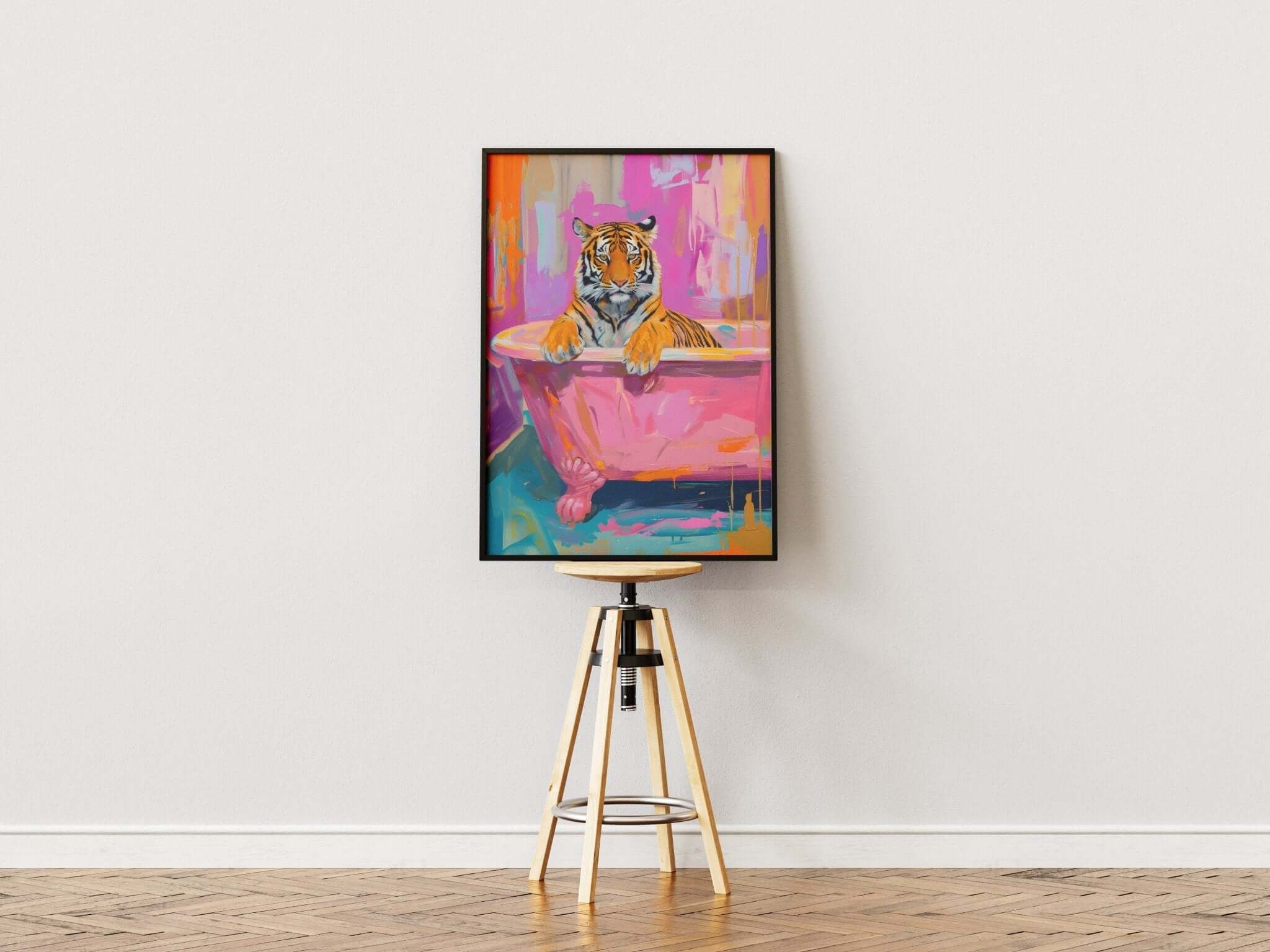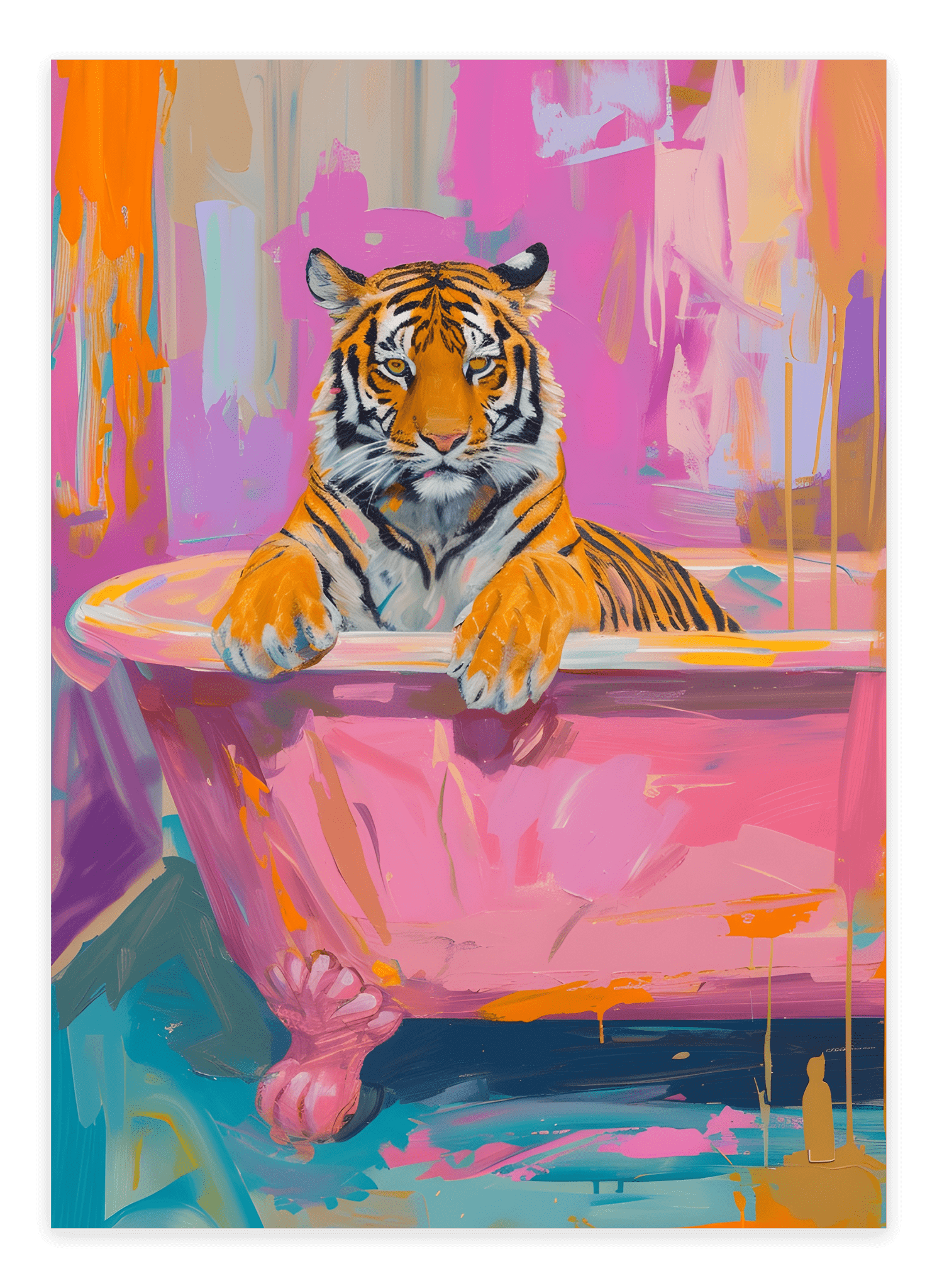 Perfekt til stuen, badeværelset eller som en del af en humoristisk billedvæg. Trykt på kvalitetsmateriale sikrer Tiger In Bath - Pink Plakat skarpe detaljer og flotte farver, der gør den til et unikt og iøjnefaldende kunstværk.