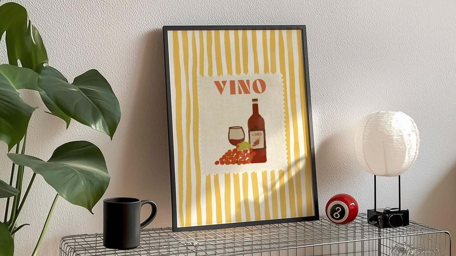 Skab sydlandsk stemning i dit hjem med denne stilfulde VINO plakat. Det varme farvespil med gule striber, rødvin og druer giver en afslappet, retro inspireret vibe – perfekt til køkkenet, spisepladsen eller din egen lille vinbar.
