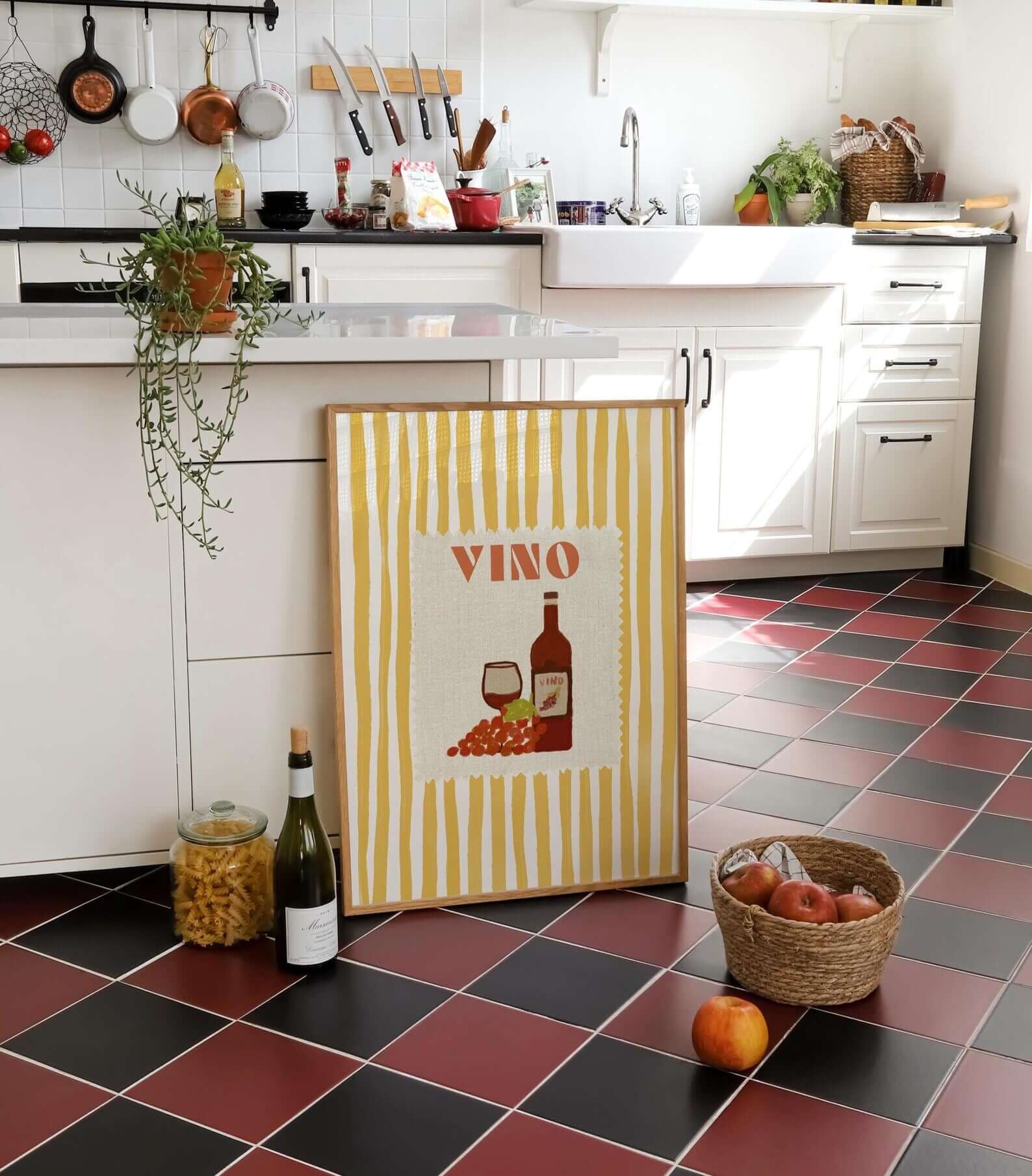 En vin plakat som denne tilfører både personlighed og hygge og fungerer smukt alene eller som en del af en billedvæg med andre køkkenplakater.