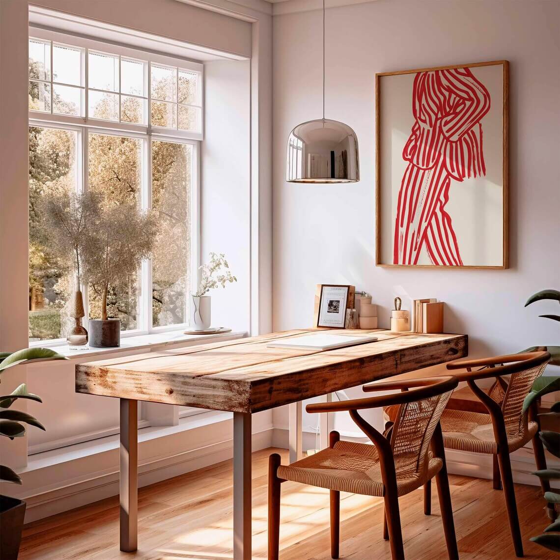 Plakaten passer perfekt ind i moderne indretning og fungerer særligt godt i stuen, soveværelset eller på kontoret, hvor den skaber varme og visuel ro. De gentagende linjer og den bløde bevægelse i motivet gør den nem at kombinere med andre plakater eller som et enkelt statement på væggen.