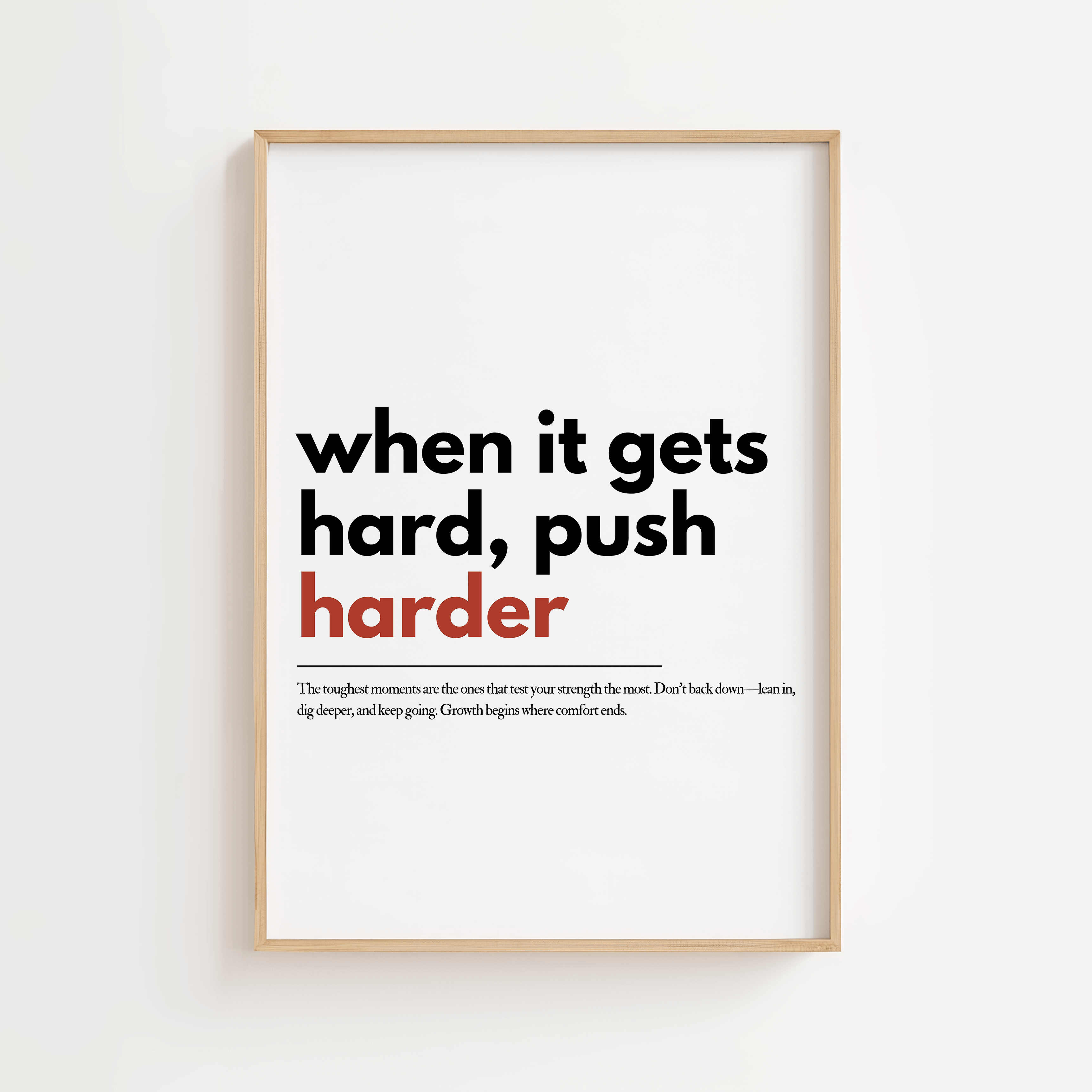 Denne motiverende plakat med citatet “When it gets hard, push harder” minder dig om, at de sværeste øjeblikke ofte er dem, hvor den største udvikling sker.