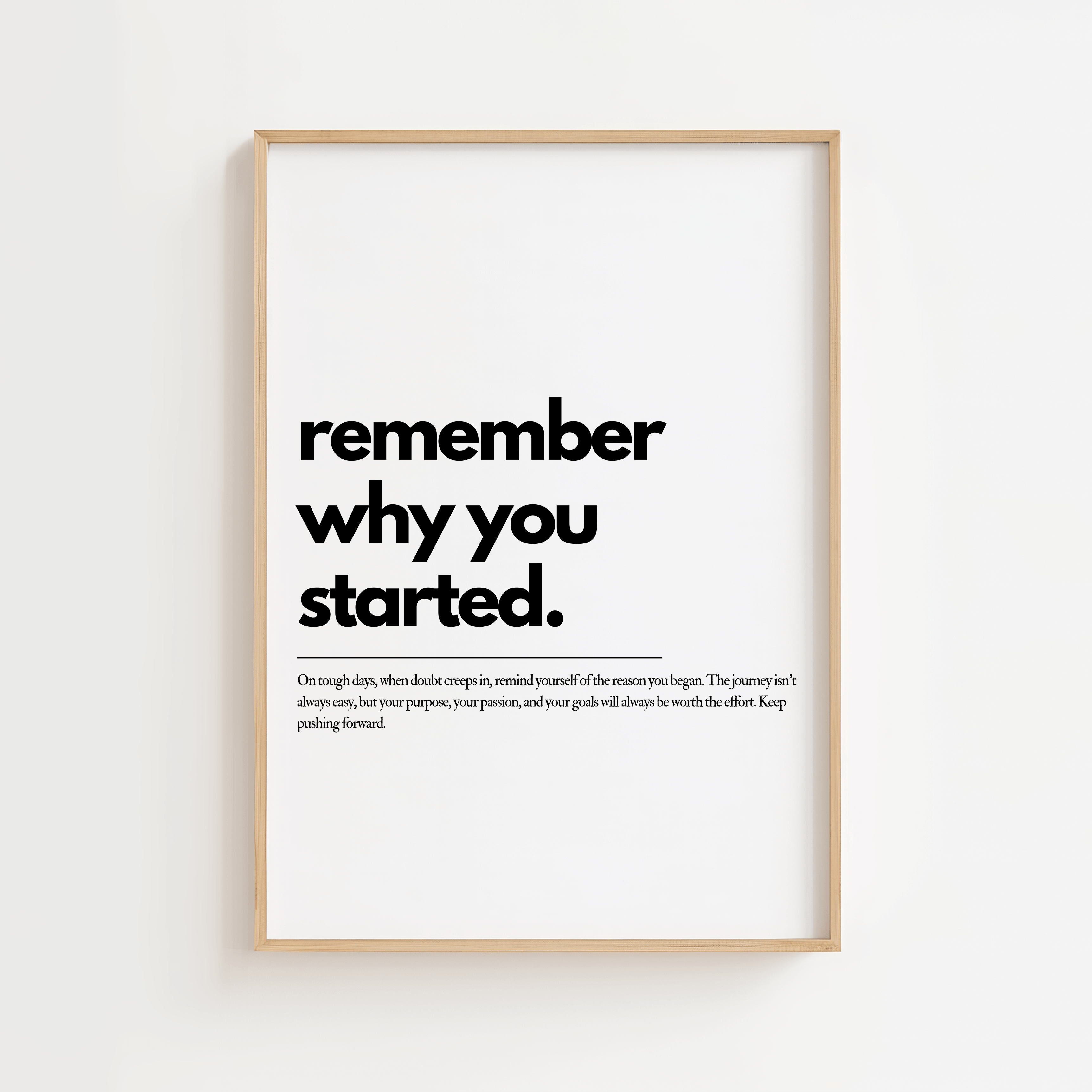 Denne motiverende plakat med citatet “Remember why you started” er en stærk påmindelse om at holde fast i din motivation – selv når det bliver svært.