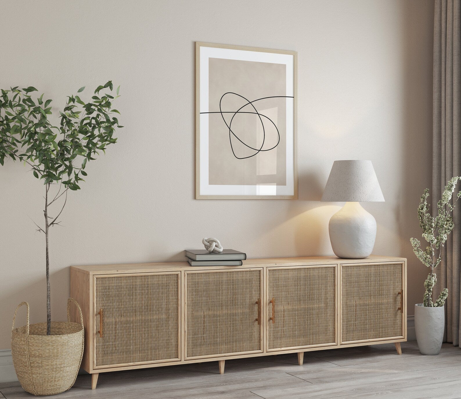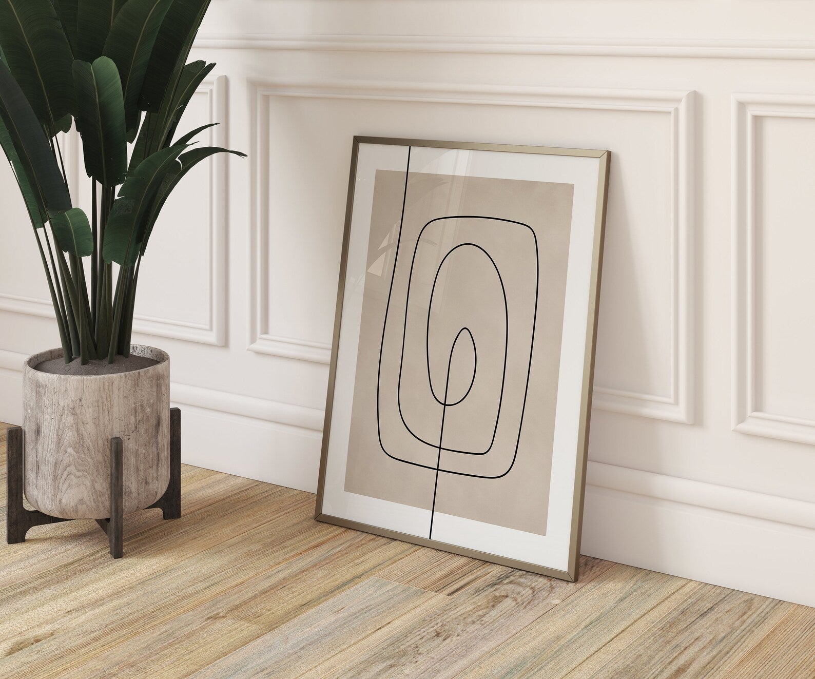 De enkle linjer giver billedvæggen et grafisk og eksklusivt look, samtidig med at de neutrale farver gør den nem at integrere i mange typer indretning. Billedvæggen tilfører karakter uden at virke tung – perfekt til dig, der ønsker moderne kunst med ro og kant.