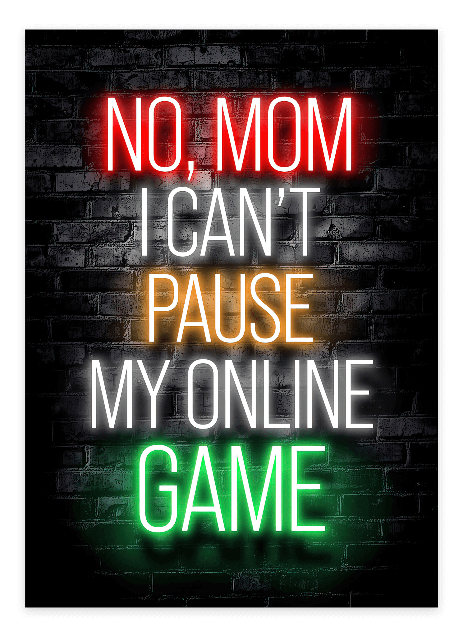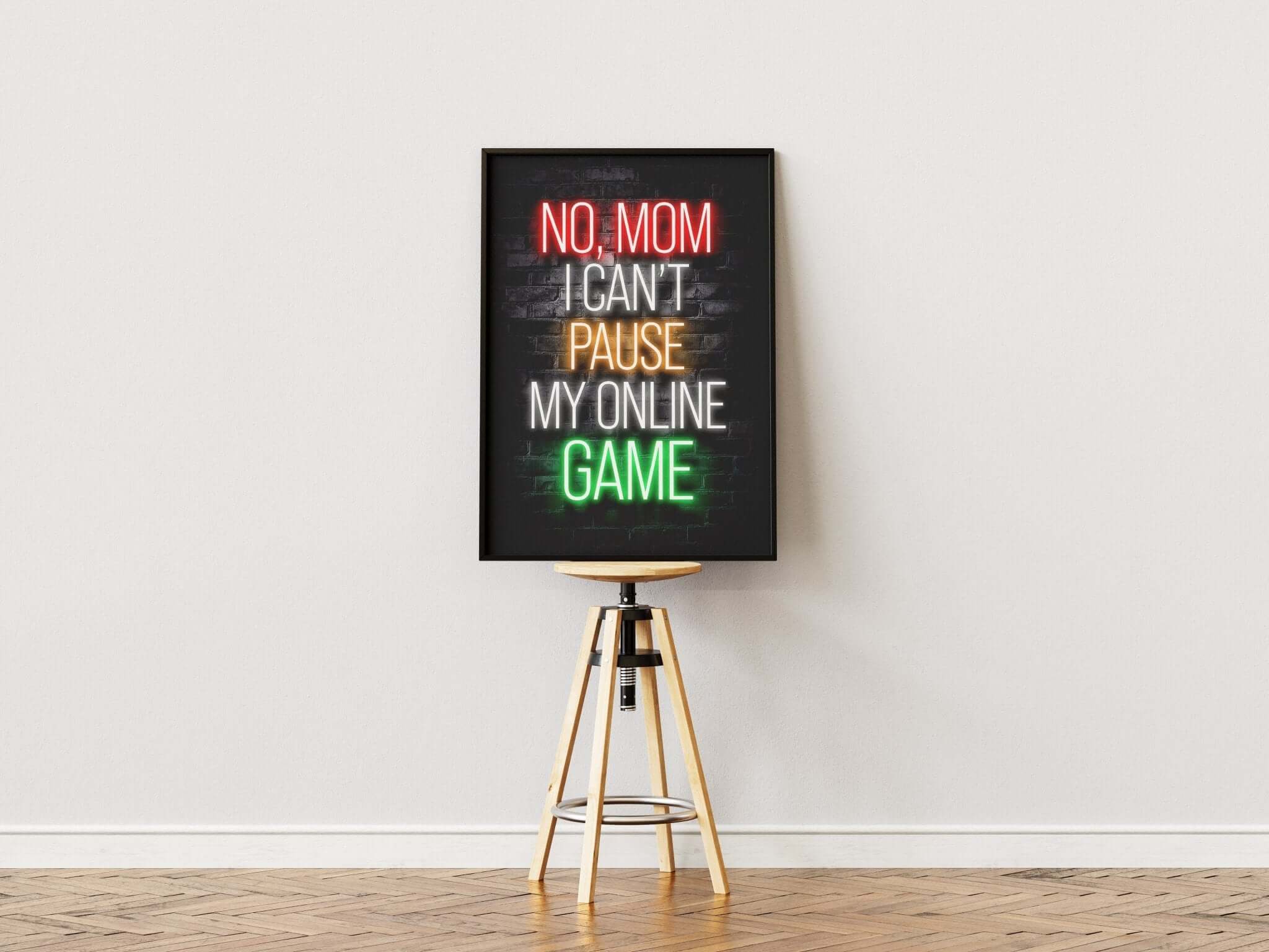 Alle gamere kender frustrationen, og nu kan du vise det med No Mom, I Can’t Pause My Online Game - Gaming Plakat! Denne sjove gamerplakat er den perfekte vægdekoration til enhver gaming-hule. Med et stilrent design og et humoristisk citat er den et must-have for enhver seriøs gamer.